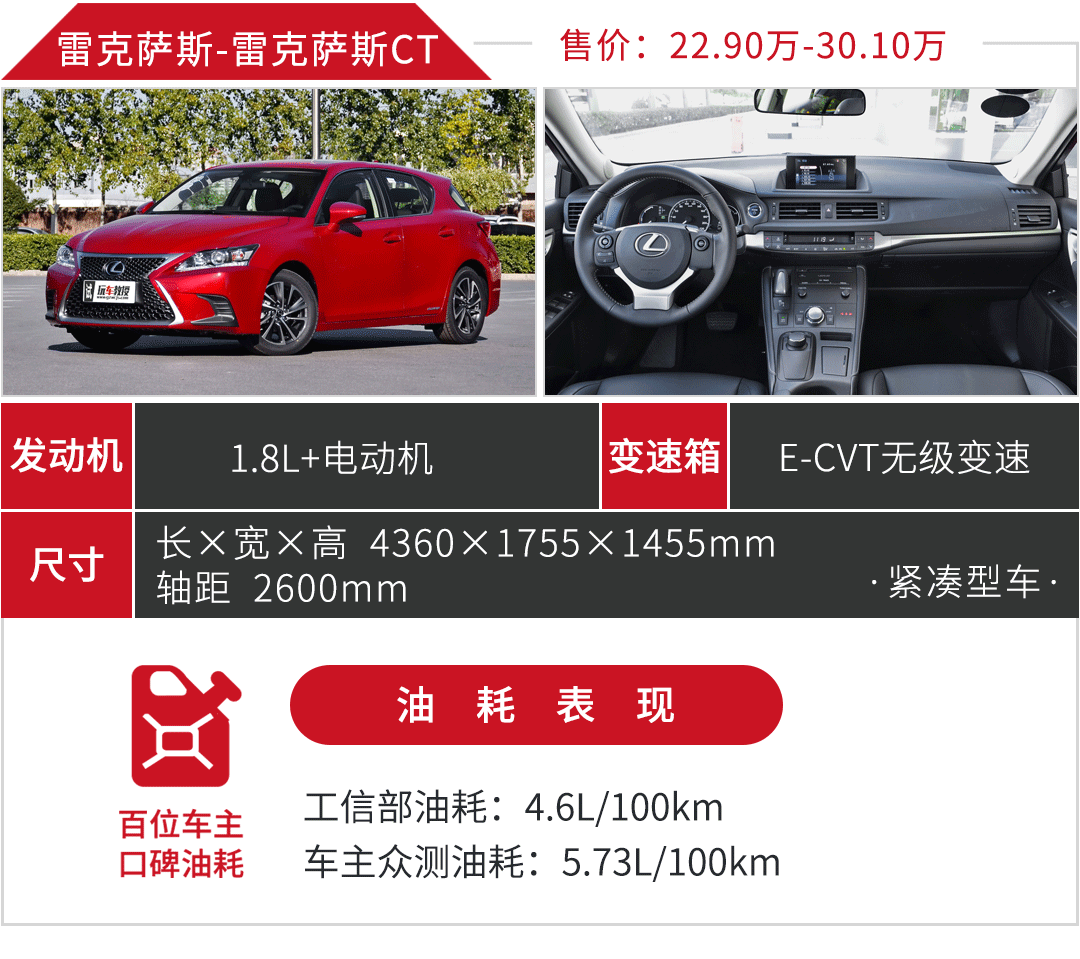 作为丰田汽车的高端品牌,雷克萨斯的混合动力技术在省油方面也非常了得。雷克萨斯CT采用LHD混合动力系统,也和雷凌、卡罗拉双擎一样带有阿特金森循环工况的发动机与发动机协同工作。在车辆起步及低速行驶时,车辆为纯电动模式,仅有电动机驱动,可实现低油耗低排放的目的,以解决了阿特金森循环低扭不足的缺陷。