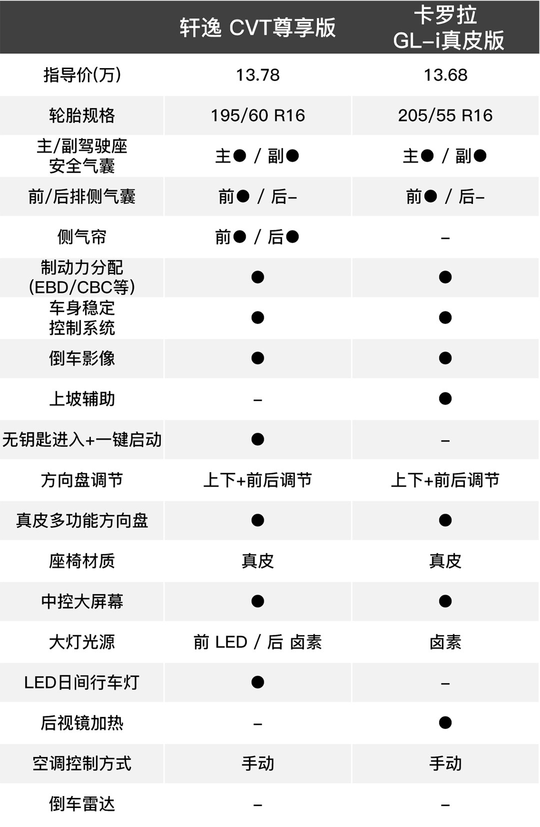 在配置方面两款车型都是各有亮点,在基本的配置水平方面,卡罗拉是略高于轩逸的,但在主动安全配置方面,轩逸则更有亮点,像BSW并线辅助系统、LDW车道偏离预警系统、FEB预碰撞智能刹车辅助系统以及CTA倒车车侧预警系统等(1.6L CVT智尊版以上),都是卡罗拉上所没有配备的,算上轩逸的优惠幅度,基本上在15万左右价格你便可以选购到一台主动安全配置如此高的车型,也是同级鲜有的存在。