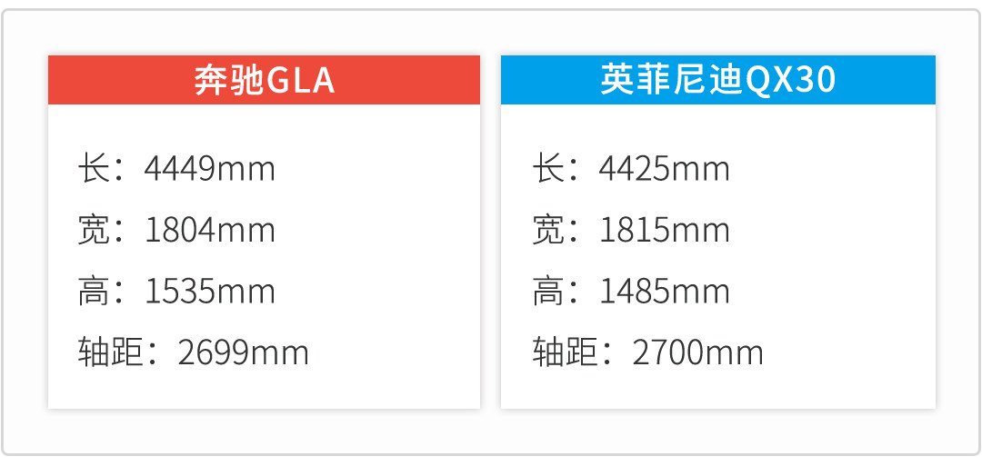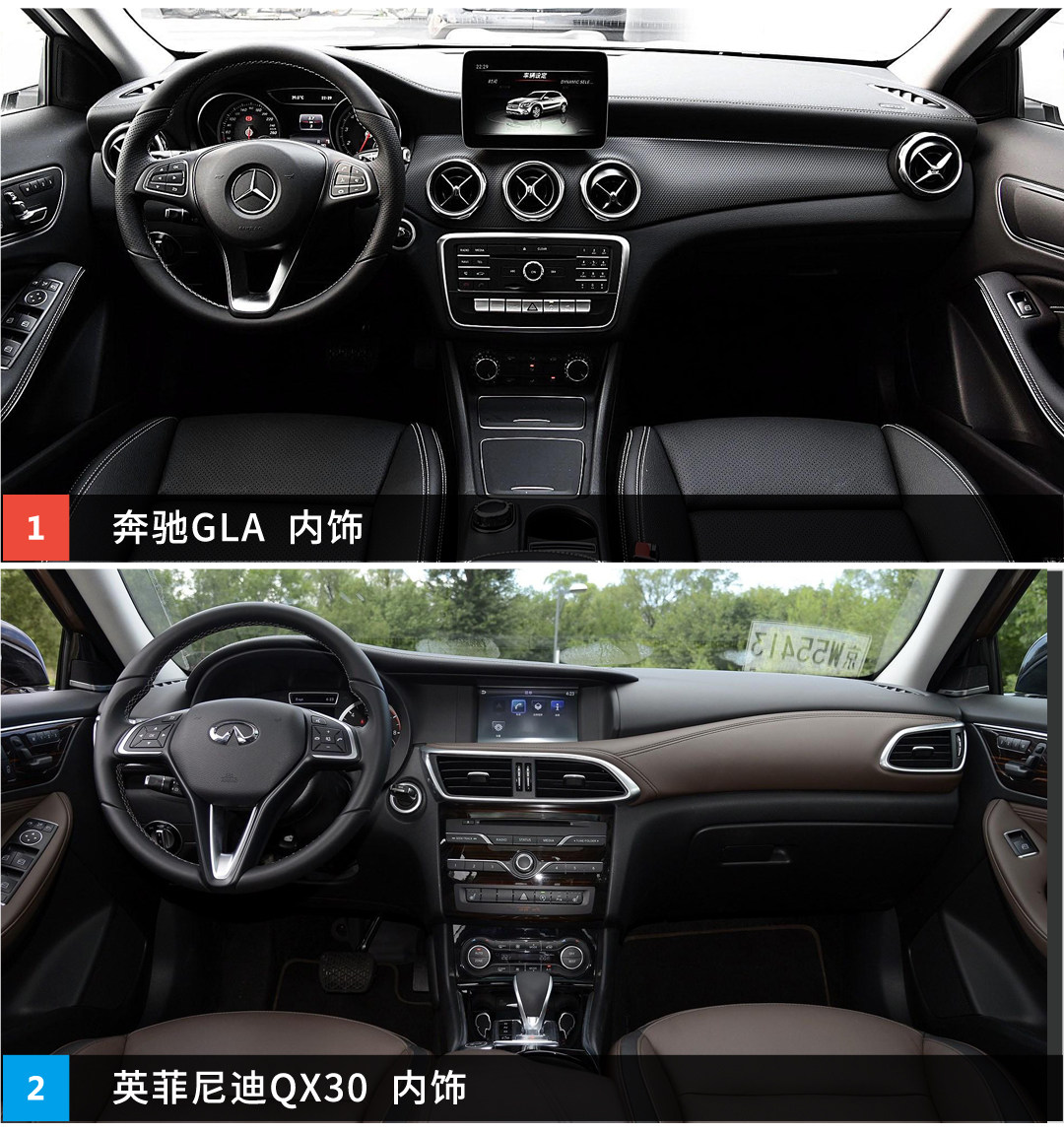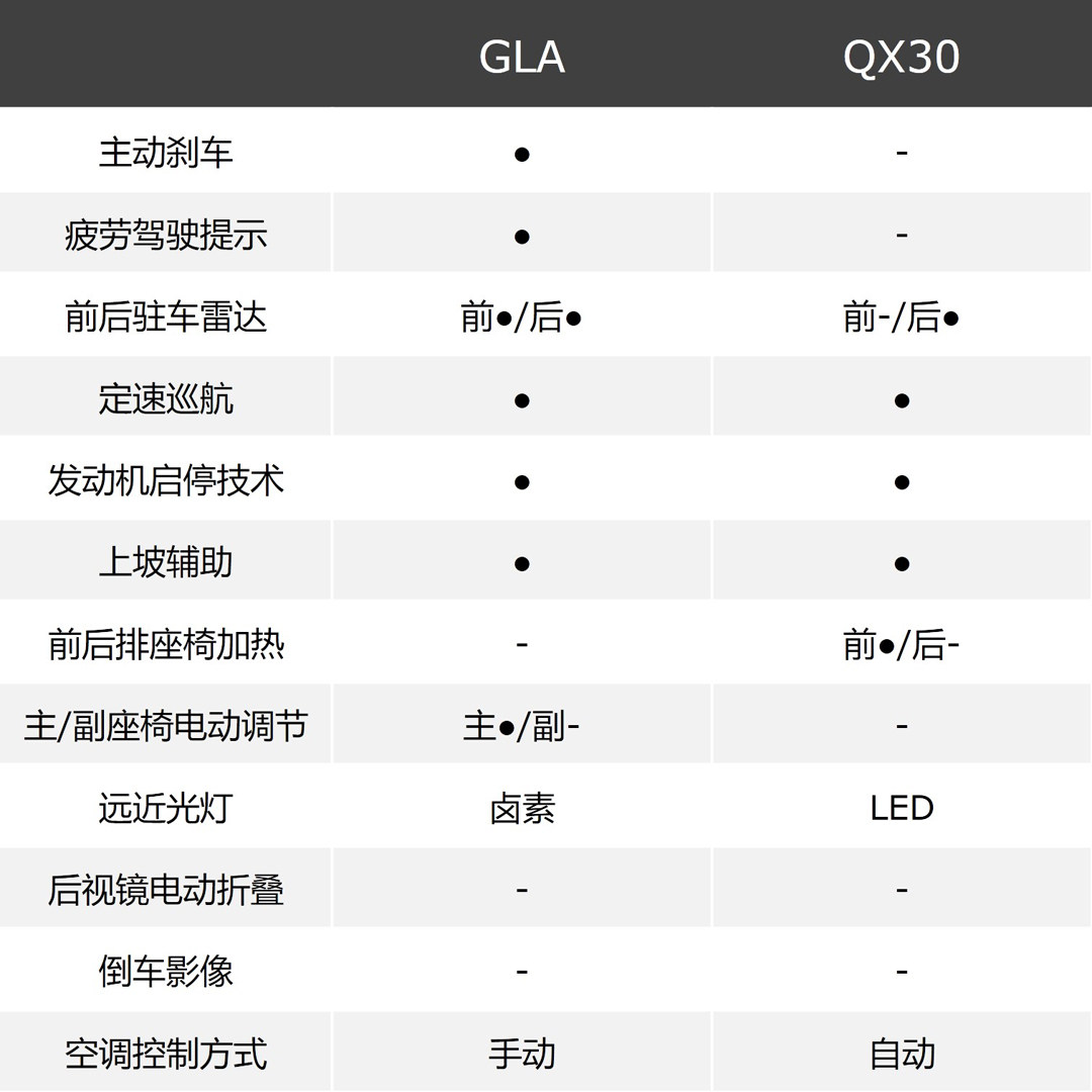 虽出自同平台,但车头的标志导致了价格的差异。QX30相比GLA在起步指导价上少了2万多,因此进行配置对比的是QX30的次低配车型与GLA乞丐版车型。