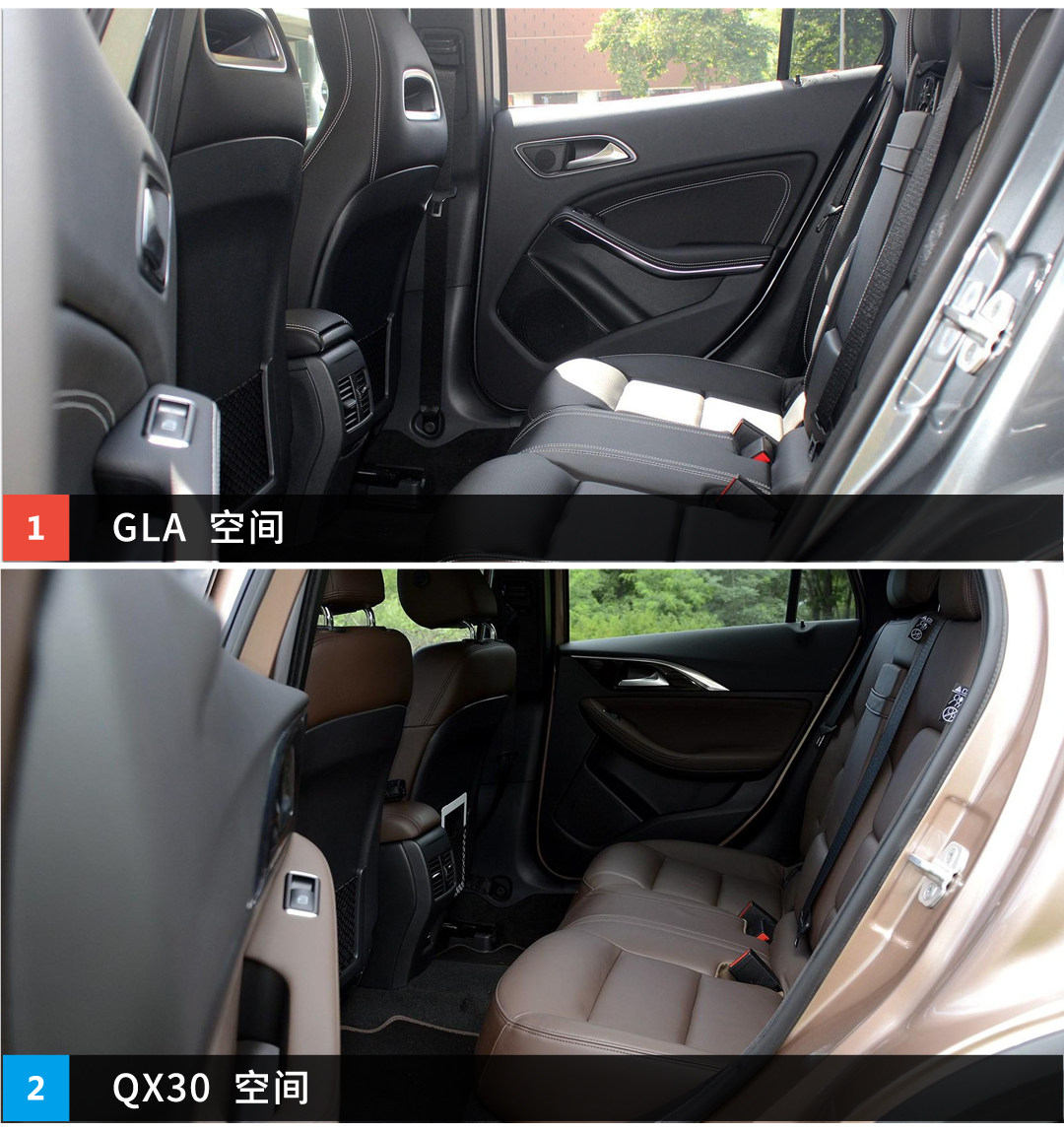 空间方面,两款源自同平台的“骨肉兄弟”的储物空间几乎一致,储物能力非常接近。但由于QX30采用排挡杆结构,而GLA使用怀挡结构,因此GLA就多出了一个颇为可观的小空间。
