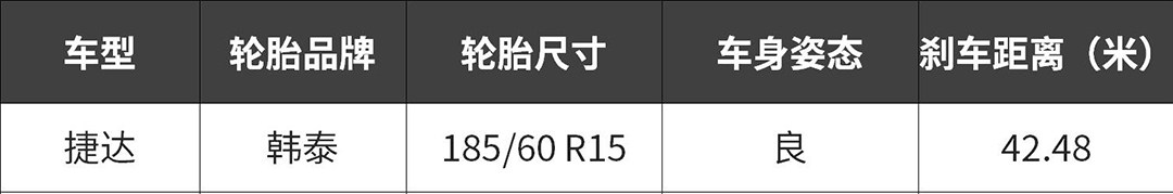 捷达使用185/60 R15 尺寸的韩泰KINERGY轮胎,全力制动的时候轮胎抓地力一般,悬挂支撑一般,由于后刹车使用鼓式刹车,连续10次测试抗热衰减一般,最好成绩100-0km/h 42.48米。