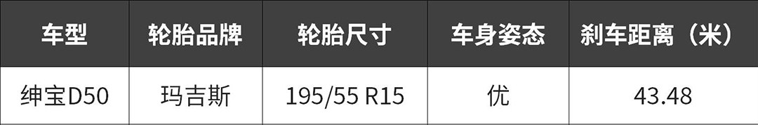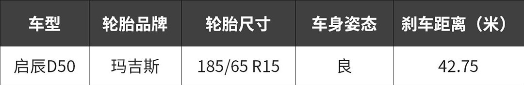 启辰D50使用的是玛吉斯MA-202 185/65 R15轮胎,轮胎宽度也是偏窄,并且轮胎本身抓地力也不足,再加上偏软的悬挂就雪上加霜,刹车使用前盘后鼓的形式抗热衰减能力一般,最终测试成绩一般,42.75米,虽然不算太差,但是在同级别对手中不具竞争力。