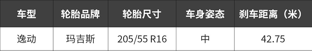 逸动使用尺寸为205/55 R16规格的玛吉斯MA656轮胎,这条轮胎更注重耐磨性,所以导致逸动的刹车一般,再加上悬挂的支撑力不足,所以最终成绩在42.75米,仅处于合格边缘。
