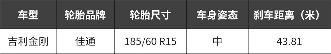 吉利金刚的刹车脚感很单薄,在刹车测试的时候,一脚下去,踏板基本没有回弹力,让人缺乏信心,最终测试成绩也如实反映了这种情况,100-0km/h成绩为43.81米,性能相当一般。