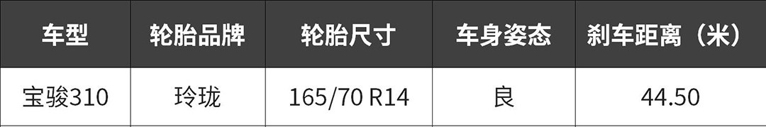 宝骏310使用玲珑GREEN-MAX HP050轮胎,尺寸为165/70 R14。165mm的胎面宽度,注定了宝骏310不会有太好的成绩,刹车G值基本在0.8左右,中后段的刹车力度不够均匀ABS介入明显。最终成绩44.50米。