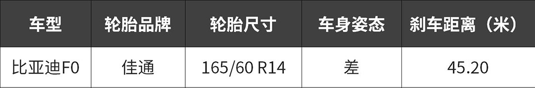 成绩仅适用于比亚迪F0 2008款豪华型。比亚迪F0使用佳通165/60 R14尺寸的轮胎,最好的成绩为45.2米,最差的成绩在47米以外。。。。并且连续刹车过程中,热衰减明显。只能说比亚迪对于成本的控制做得相当好,4万左右就能买到一辆汽车,本身就是一种奇迹。