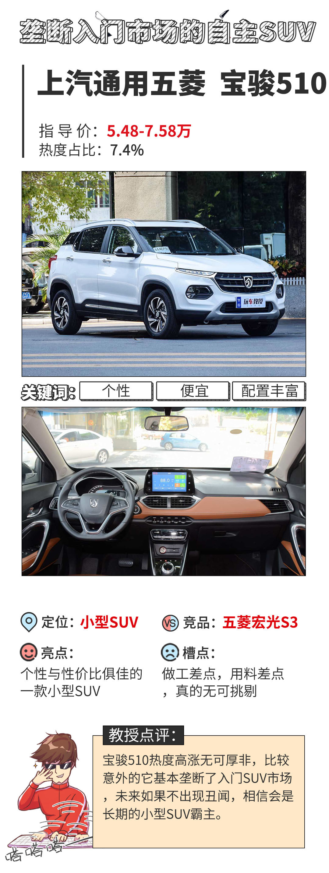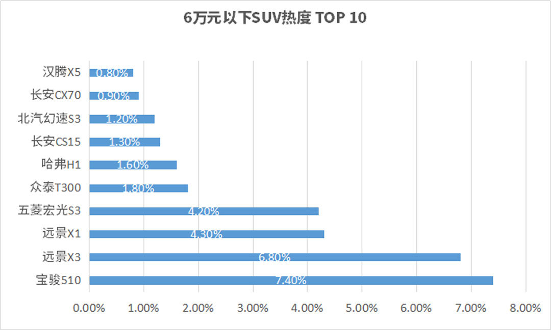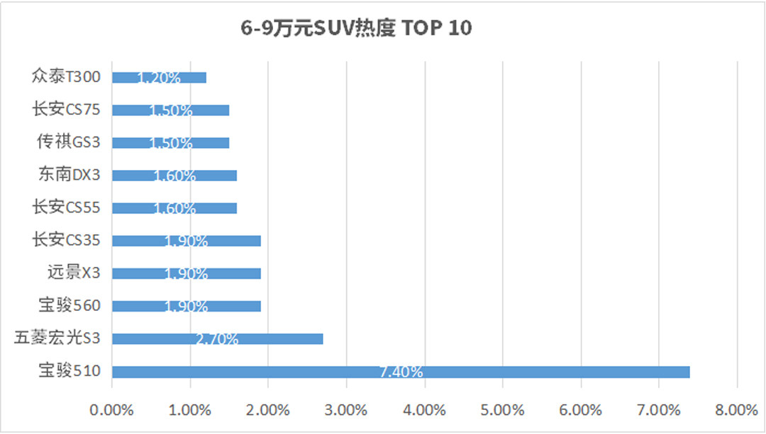 在9万元以下SUV购车的热度上,宝骏510无疑优势巨大,与对手相比基本是碾压的水准;而且从数据上看,前三名同属五菱旗下,可以预见未来的很长时间里,6-9万元预算的购车热度上,这三款车仍会占据前列。如果论及威胁,可能也仅有同有三款车上榜的长安汽车了。