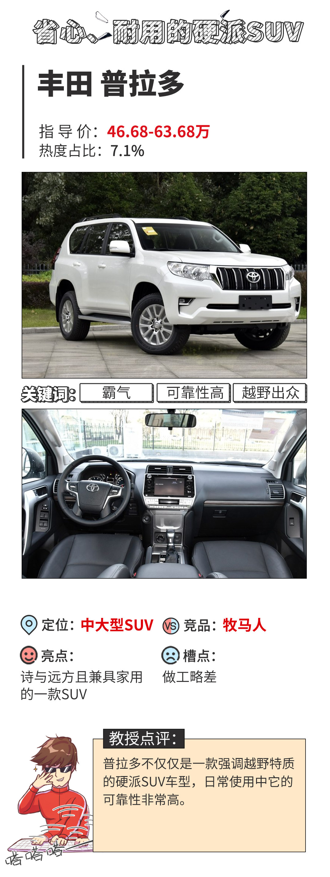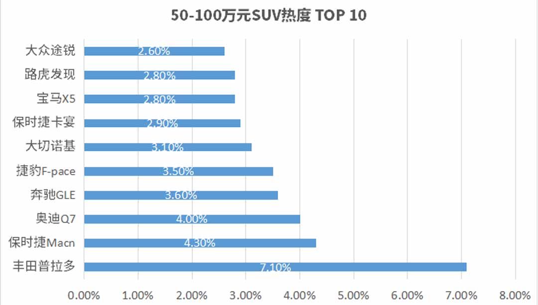 而在50-100万预算的购车热度中,普拉多的上榜确实有些让人意外。在这个区间中,普遍的选择保时捷Macan、奥迪Q7等豪华SUV车型,这次中庸的普拉多能够上榜相信也是凭借着省心、耐用的良好口碑。