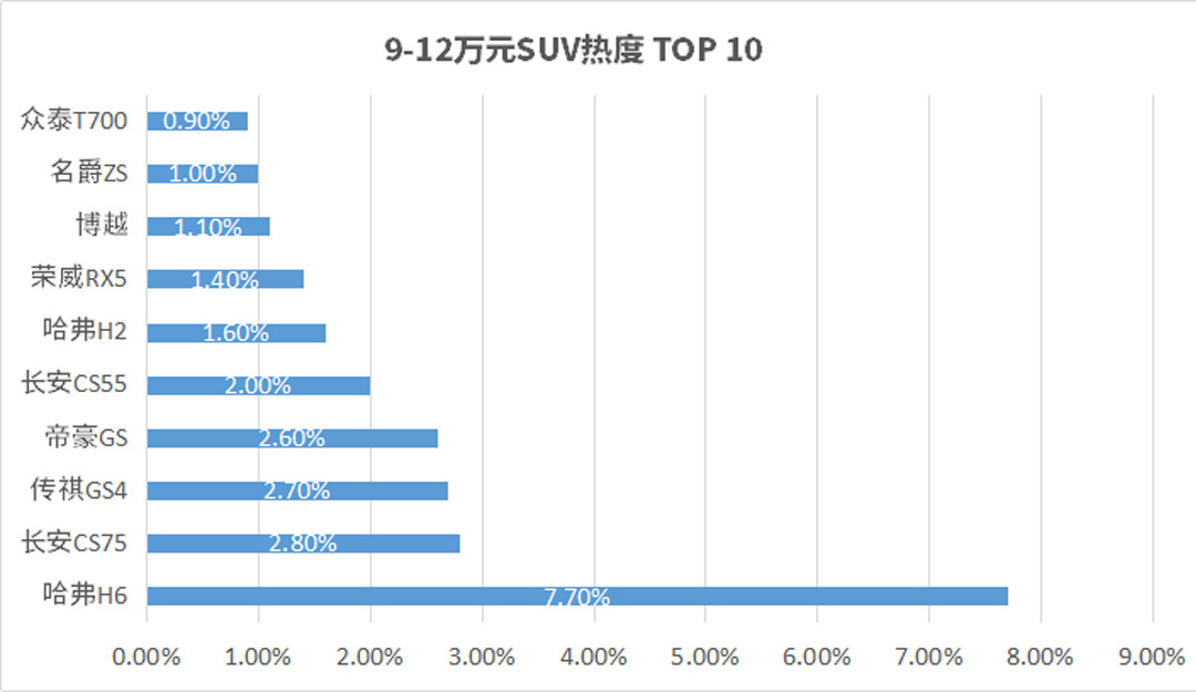 而在9-12万元预算的购车热度中,依然是大家熟悉的老面孔—哈弗H6。虽然哈弗H6由于换代的缘故曾短暂低迷,但多年累积的口碑足以支撑它保持SUV霸主地位。除却H6这款SUV,这个区间的车型基本各自为政,比较意外的是长安CS55也出现在此价格区间,如果算上前一个区间的数据,CS55热度真的不差。