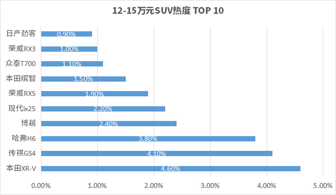 15万元相信是大多数人购车时的预算,因此在12-15万元预算的购车热度中,出现了不同级别SUV共同争夺市场的局面,各个车型大展神通,榜首的XR-V与其余的对手差距不大,稍有不慎下个月就有可能被超越。随着像斯柯达柯洛克与丰田C-HR等对手的进入,这个区间的竞争将会进一步白热化。
