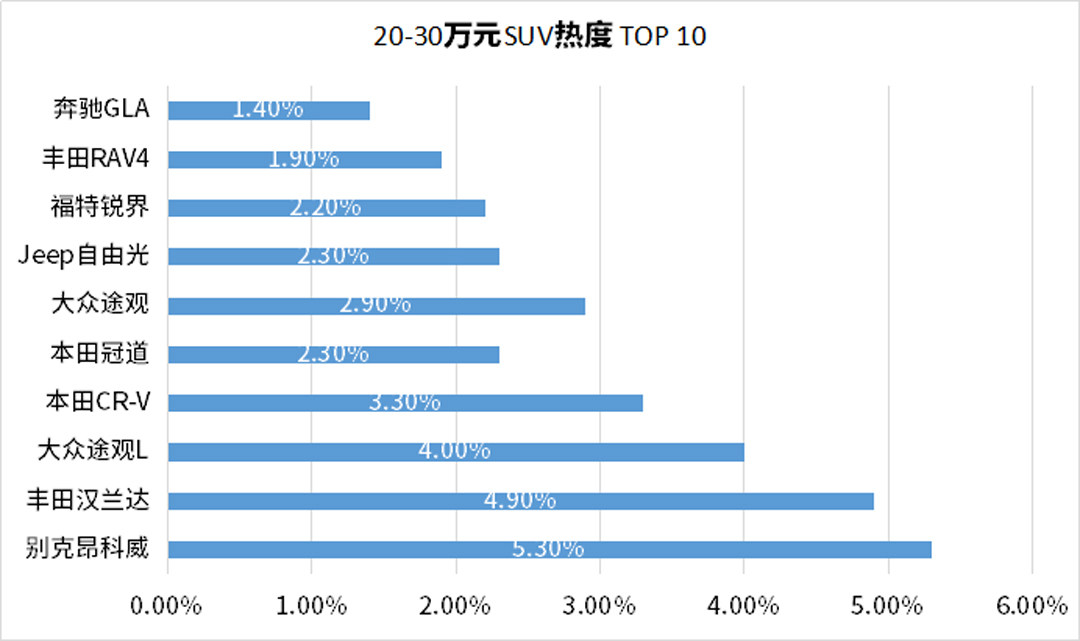 与上个区间自主品牌不断威胁合资品牌不同,20-30万元预算的购车热度中基本上是合资主流品牌的阵地,这个区间向来是合资品牌竞争最为激烈的细分市场,基本上能够上榜的车型没有一款是实力逊色的SUV,基本差距很小。这次昂科威能够上榜肯定与它改款有关,凸显精致感的全新外观配合9AT变速箱确实比较亮相,性价比也进一步放大。