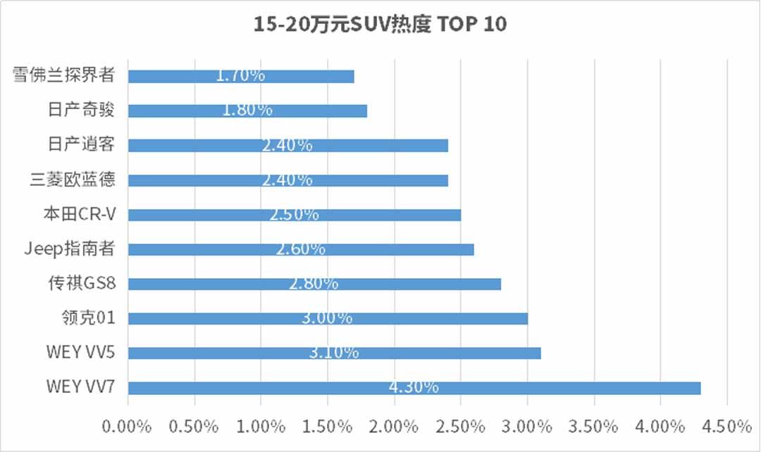SUV向来是市场变化的风向标,虽然近年来合资品牌希望通过推出新产品、降价来压缩自主品牌在SUV市场的影响力,不过随着自主品牌的不断修炼,大量实力出众的产品纷纷亮相,入门级市场已经被自主品牌垄断,甚至有着进一步威胁合资品牌的趋势。接下来我们通过数据看看最新1月份到底哪些SUV车型最受消费者关注,谁有实力挑战下个月的热度?