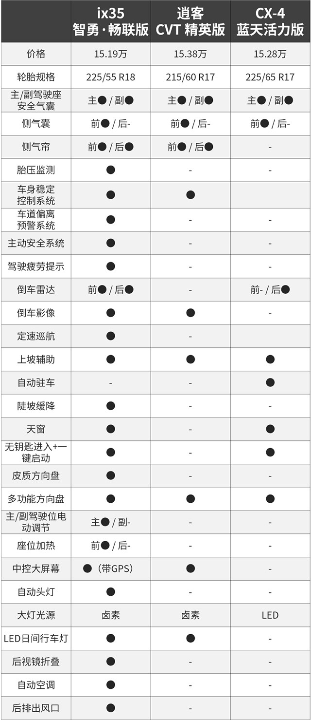 15万左右的预算就能买到合资SUV,说实话真的是挺吸引的,而对于以上三款车型来说,无疑不是其细分市场当中的叫佼佼者。在教授看来,这几款车型在价格方面已经占尽了优势,假如你日后的用车需求偏向于家用代步车行的话,教授更建议你考虑ix35或者逍客;假如你是一位热爱操控的消费者,CX-4绝对满足到你的要求。