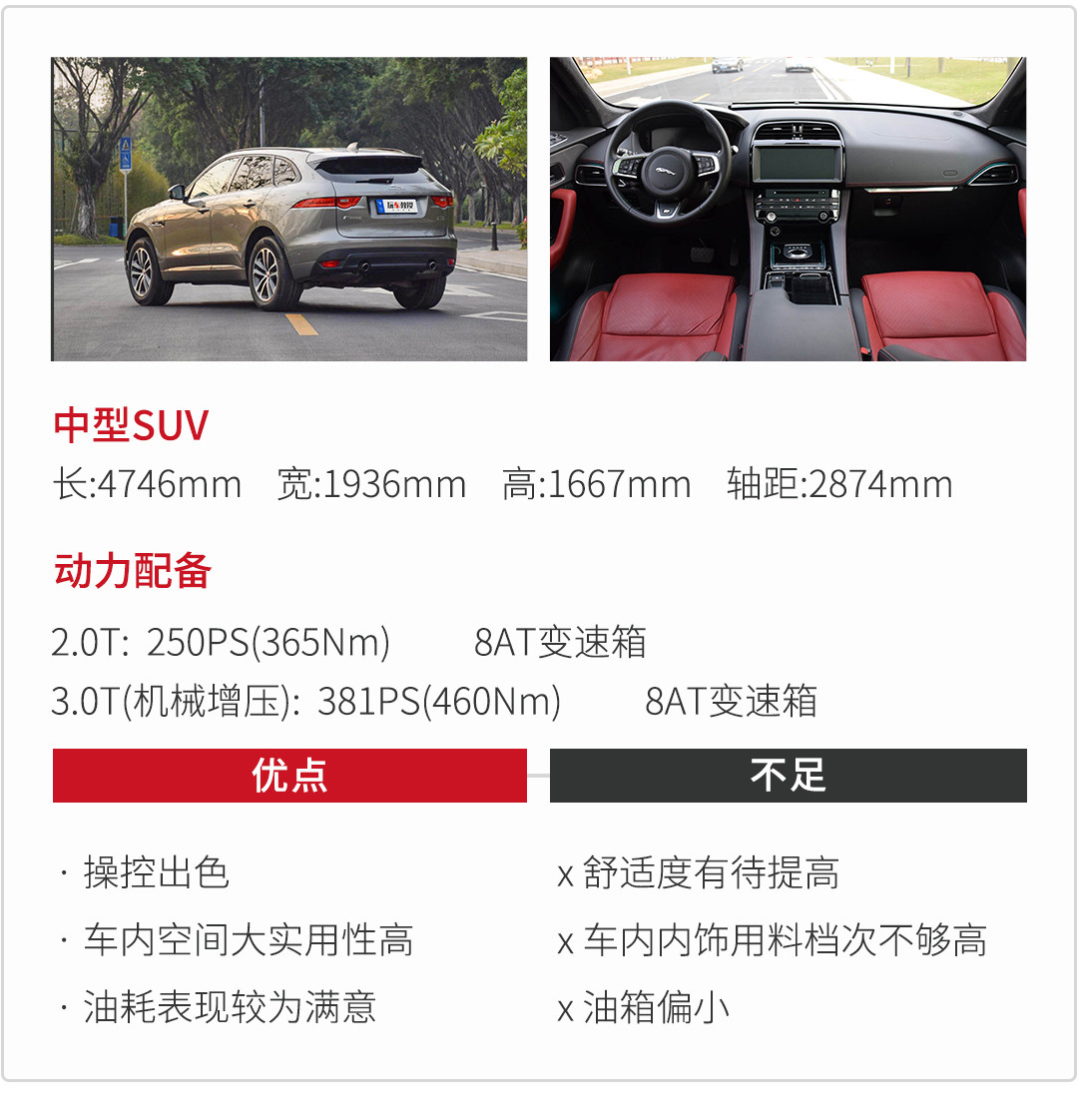 教授辣评:捷豹总被我们戏称7折豹,最大的原因在于在终端有着极大的优惠幅度。而捷豹一直以来都是以运动著称,即便是SUV也是如此,在造型方面给足你足够的运动感以外,在操控上也能给你带来无尽的乐趣。