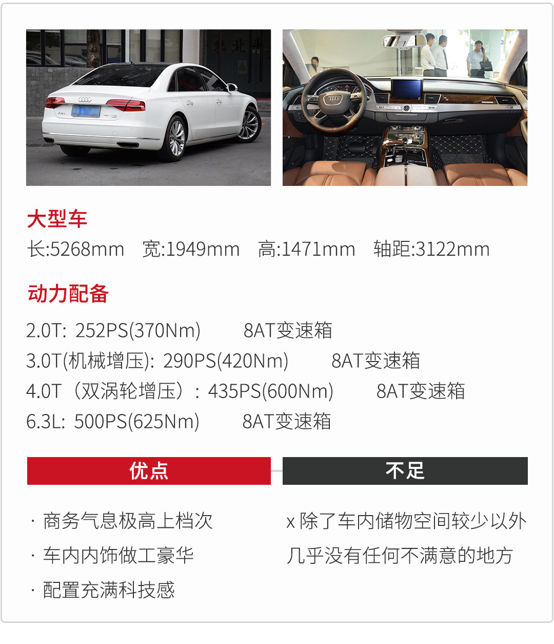 教授辣评:在普遍情况下,越豪华的车型在优惠幅度上越大,而这一款A8作为奥迪旗下的旗舰版车型,拥有着极为大气的造型设计以及配备上最先进的科技配置,也让它成为了各大成功人士的首选车型,充满着浓浓的高端商务气息。