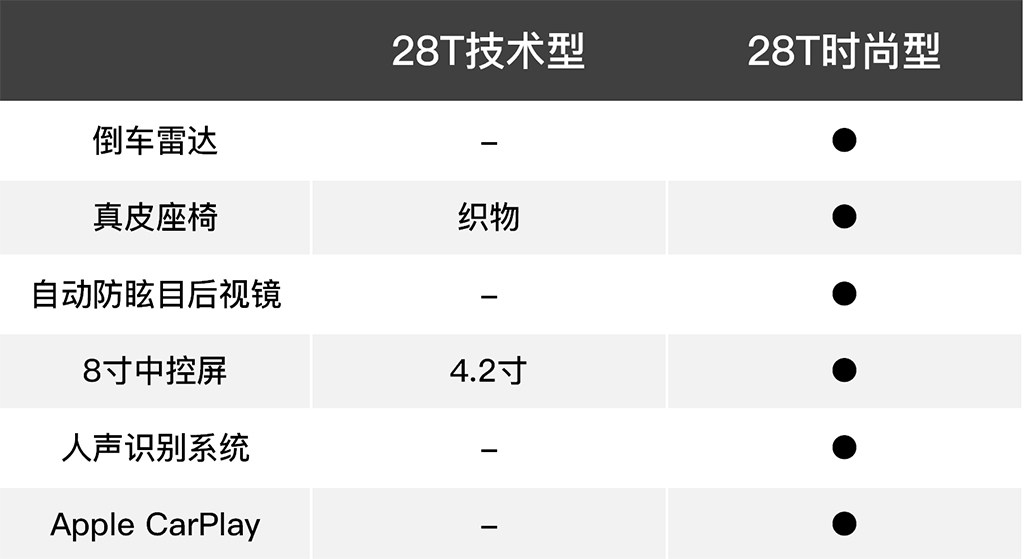 那么,次低配的28T时尚型与乞丐版的28T技术型,在指导价相差2万元的基础上,配置有何差异呢?配置差异包括了后倒车雷达、真皮座椅(乞丐版为织物)、自动防炫目后视镜、8寸中控屏(乞丐版为4.2寸)、人声识别系统和Apple Car Play等。