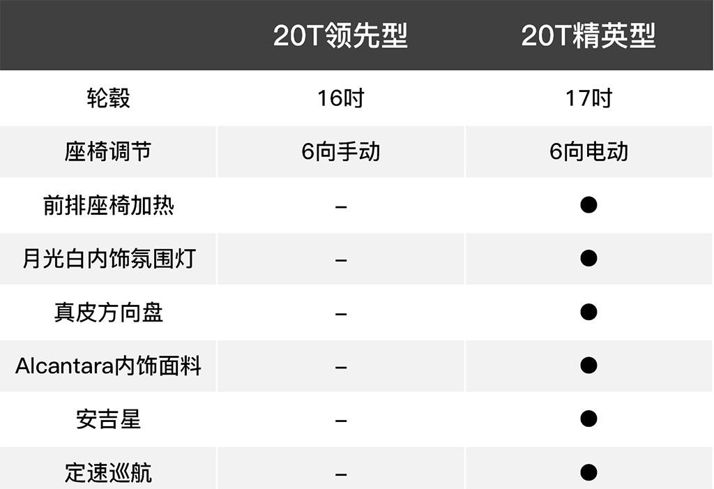 然后我们再来看看,指导价18.58万的次低配20T精英型,比指导价17.58万的乞丐版20T领先型多了什么配置。这其中包含了17吋运动轮毂(乞丐版16吋)、Alcantara麂皮绒面座椅(次低配就有,让人惊喜)、座椅电动调节(乞丐版手动)、前排座椅加热、月光白氛围灯、安吉星(带发动机远程启动)和定速巡航。