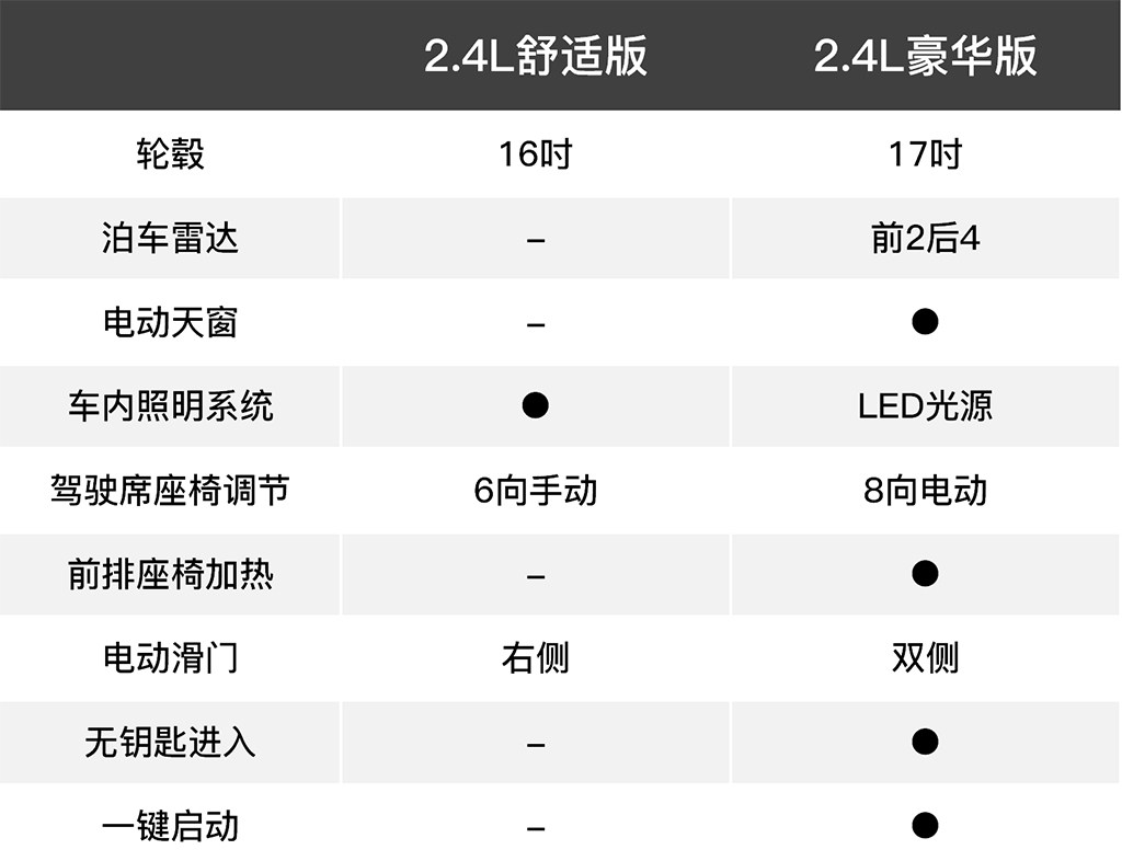 指导价24.98万的次低配(豪华版)与指导价22.98万的乞丐版(舒适版)价差为2万元,配置差异包括17吋轮毂(乞丐版为16吋)、前2后4泊车雷达、电动天窗、LED照明灯、电动/真皮座椅、座椅加热,以及教授认为对一辆奢适MPV来说很重要的,双侧电滑门(乞丐版为右侧)。