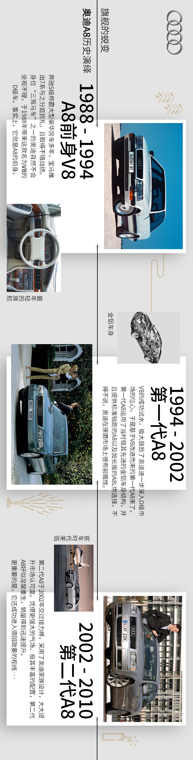 2017年,奥迪入华第30周年。2018,是奥迪大型豪华轿车(D级车)问世30年的日子,适逢全新一代奥迪A8/A8L(第4代)将在几个月后正式于中国上市。今天我们就来看看“德系三驾马车”之一的奥迪,如何在不到30年的时间里将其年轻的家族旗舰 - 奥迪A8,带领到一个能与历史悠久的奔驰S级、宝马7系并驾齐驱的地位的。