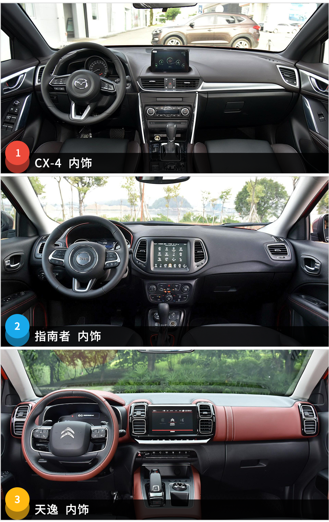 JEEP指南者的内饰设计其实也有进步了,但相对比之下,依然显得有点廉价。而在做工和用料方面,指南者是比较有优势的,尤其喜欢座椅的乘坐体验。至于马自达CX-4嘛,整个内饰设计几乎毫无亮点,做工倒是还好。