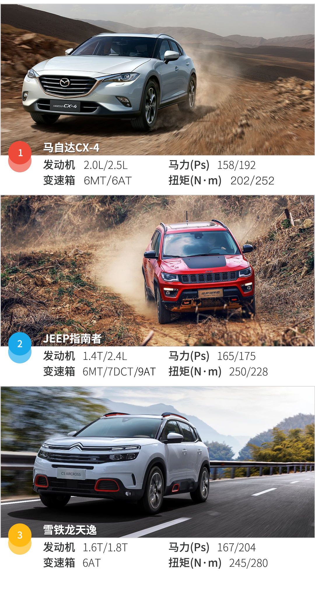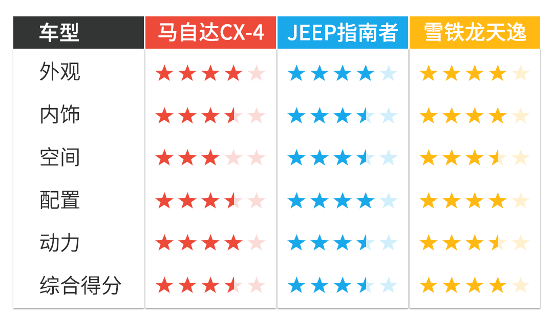 这个级别的合资SUV车型价格动辄要18-20万,而这三款起步价相对较低的SUV车型不但实力不错,还各有各的特点。其中表现最均衡的就是雪铁龙天逸,这款车的优点都比较适合家用。其次是马自达CX-4和JEEP指南者在视觉上就偏向运动感,只是在配置方面会比较差强人意。但总体而言,它们仨的性价比都挺高的。
