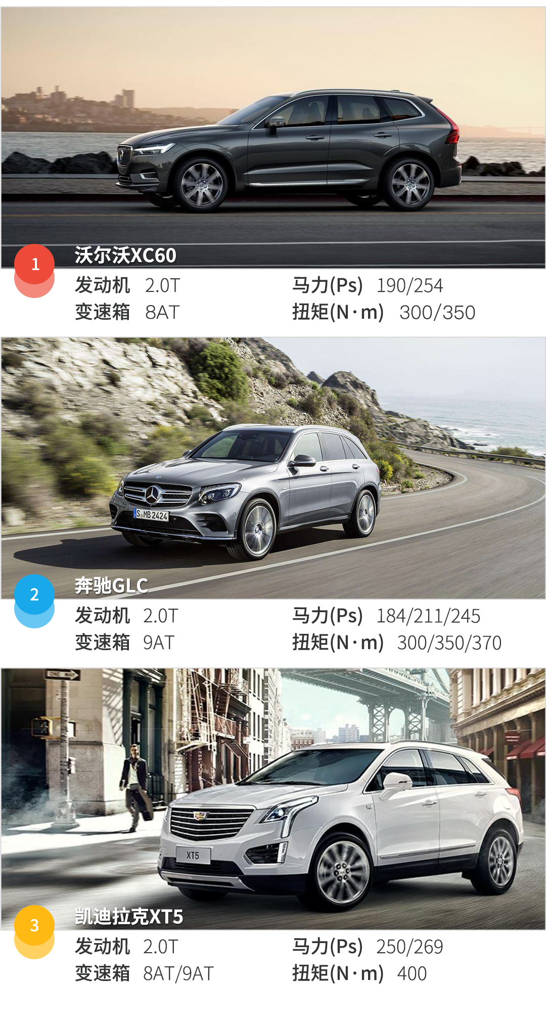 把三辆车中接近40万的车型选出来,马力输出最好的是沃尔沃XC60,百公里加速最快的也是它。而扭矩表现最好的则是凯迪拉克XT5,但百公里加速表现只能和奔驰相差无几,要知道奔驰在动力输出方面差得可不是一丁半点。
