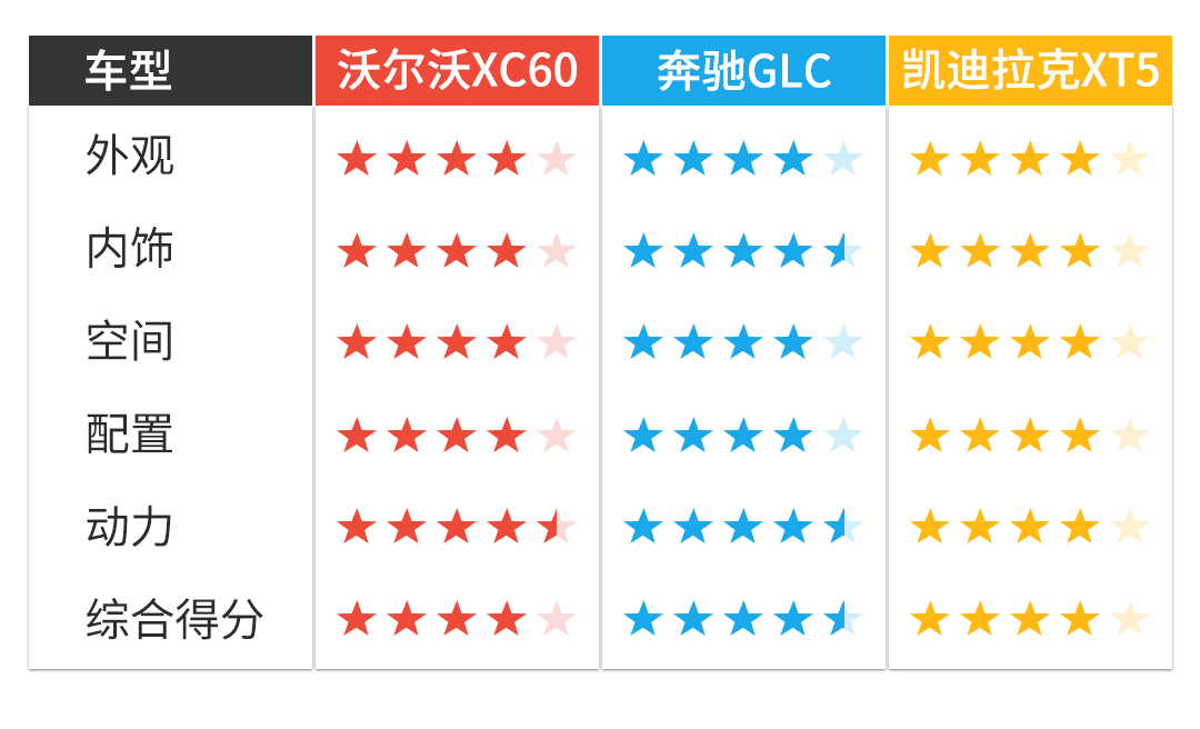 在三款车当中,他们各有各的特点:沃尔沃XC60动力表现最好,凯迪拉克XT5的尺寸有优势,而奔驰GLC低配车型的性价是最高的。萝卜青菜各有所爱,自己喜欢就好。