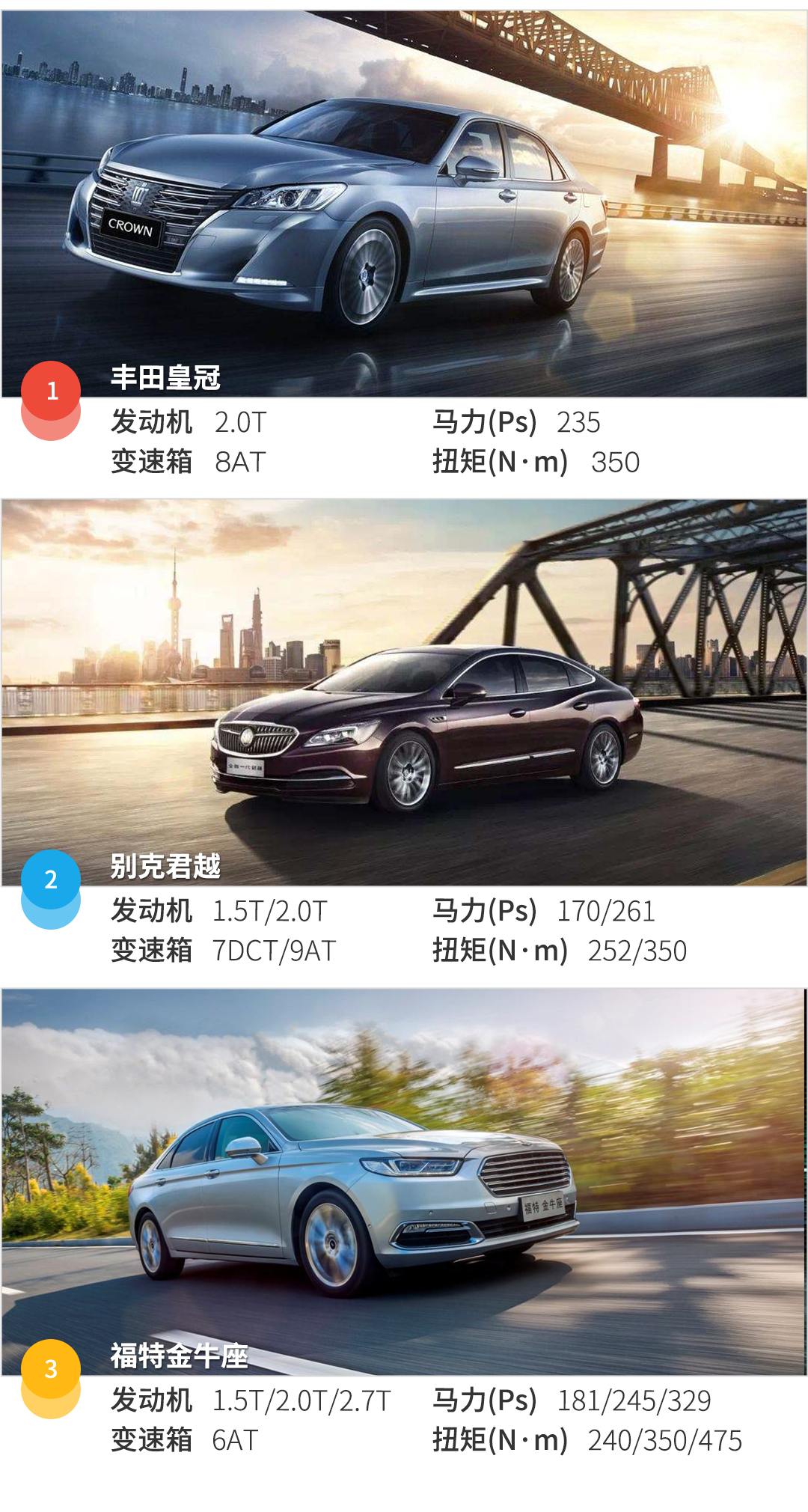 三款车匹配的变速箱来历不一样,连挡位数都不相同。表现最稳定的是皇冠的8AT,技术先进程度最高的君越上面的9AT,只金牛座的变速箱在参数上处于劣势。