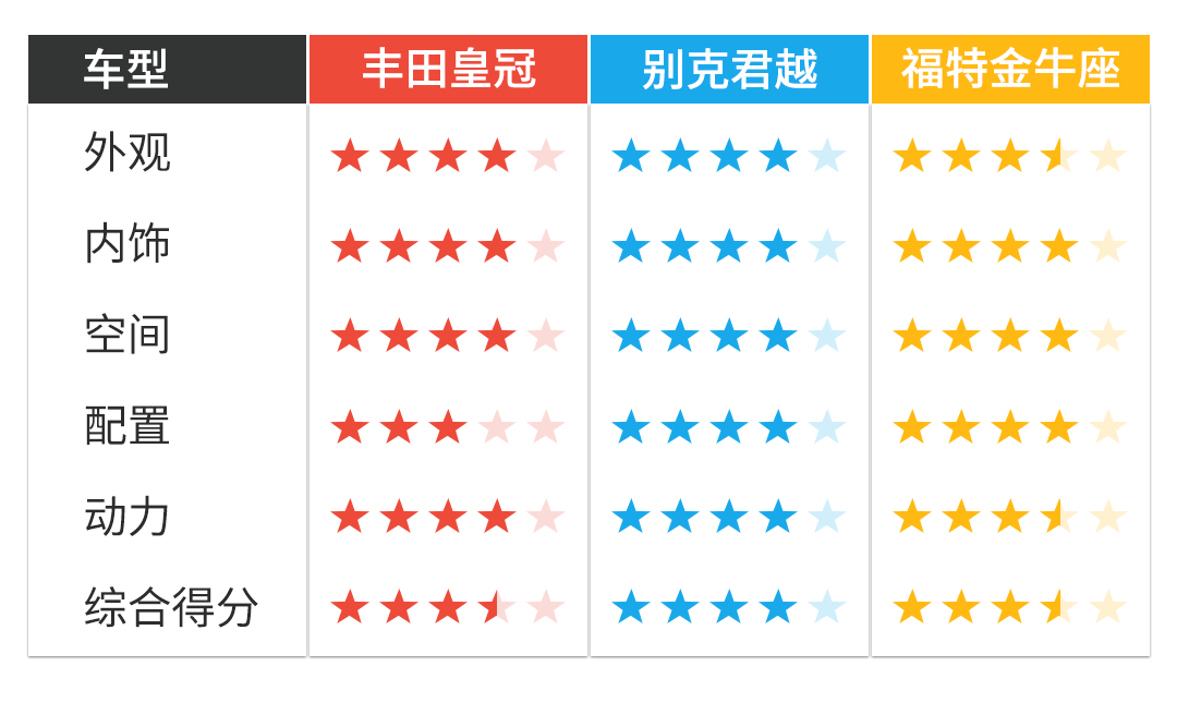 在这三款车中,最有情怀的车型要数皇冠,它已经是两代人的记忆,只是现在定位有点模糊。君越是最有气场的车型,看起来也非常体面,但是在性能和舒适性之间却平衡得不够好。至于金牛座,这辆车在国内毫无沉淀,自身也噱头不足,销量堪忧很正常。至于大家喜欢谁,主要还是看外观吧!