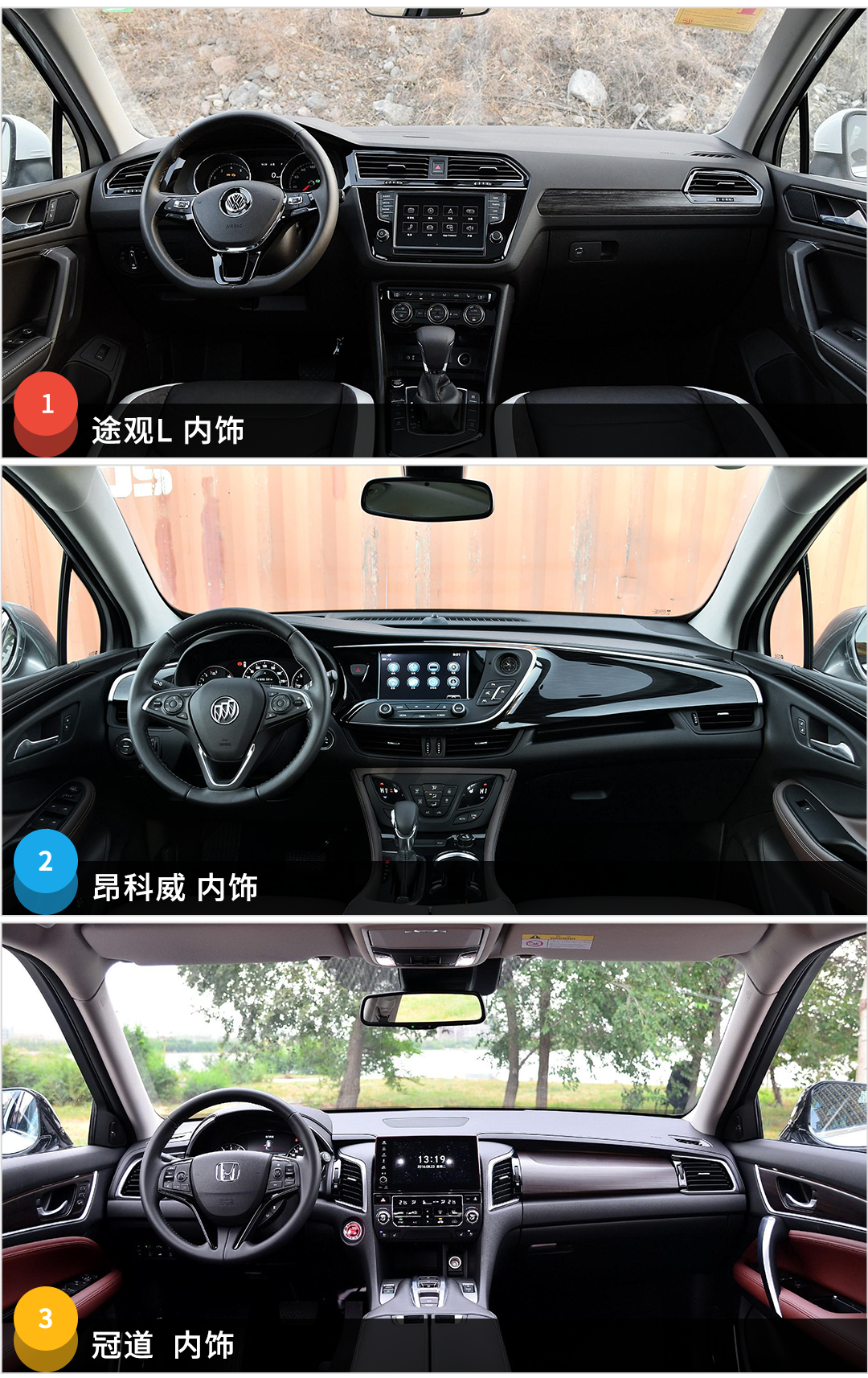 三辆车的内饰各有特色,大众途观L延续了大众一贯的那种直线条设计,做工一如既往地紧致。而昂科威的内饰设计有很大变化,布局整体偏向驾驶座那边,环抱式车厢以及部分曲面设计让这内饰很雅致。至于冠道的内饰嘛,相对来说是三辆车当中设计感最年轻的,层次感特别好。