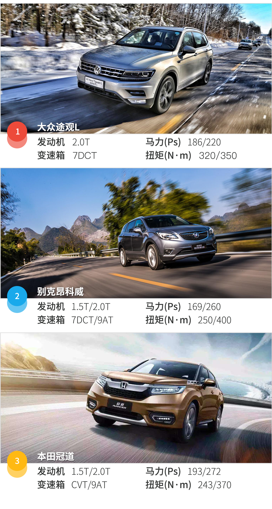 如果把选车的价位定位25万左右,那我们可以选到三款车的小排量车型。其中排量最大的途观L,扭矩表现也是它最好;马力输出最强的是冠道的1.5T发动机,可以爆发193马力,但扭矩却只有243牛米。而从实测的百公里加速来看,拥有最高马力输出的冠道能跑进9秒以内,足以看出这副发动机的强大之处。