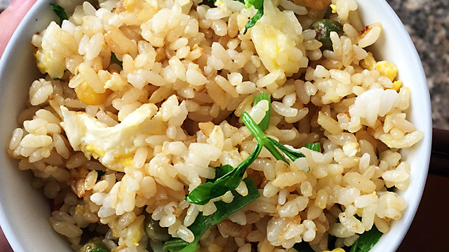 第二天中午,老妈把昨晚剩下的米饭加了两个鸡蛋和一点香菜做成了炒饭,香味引得我嘴馋。