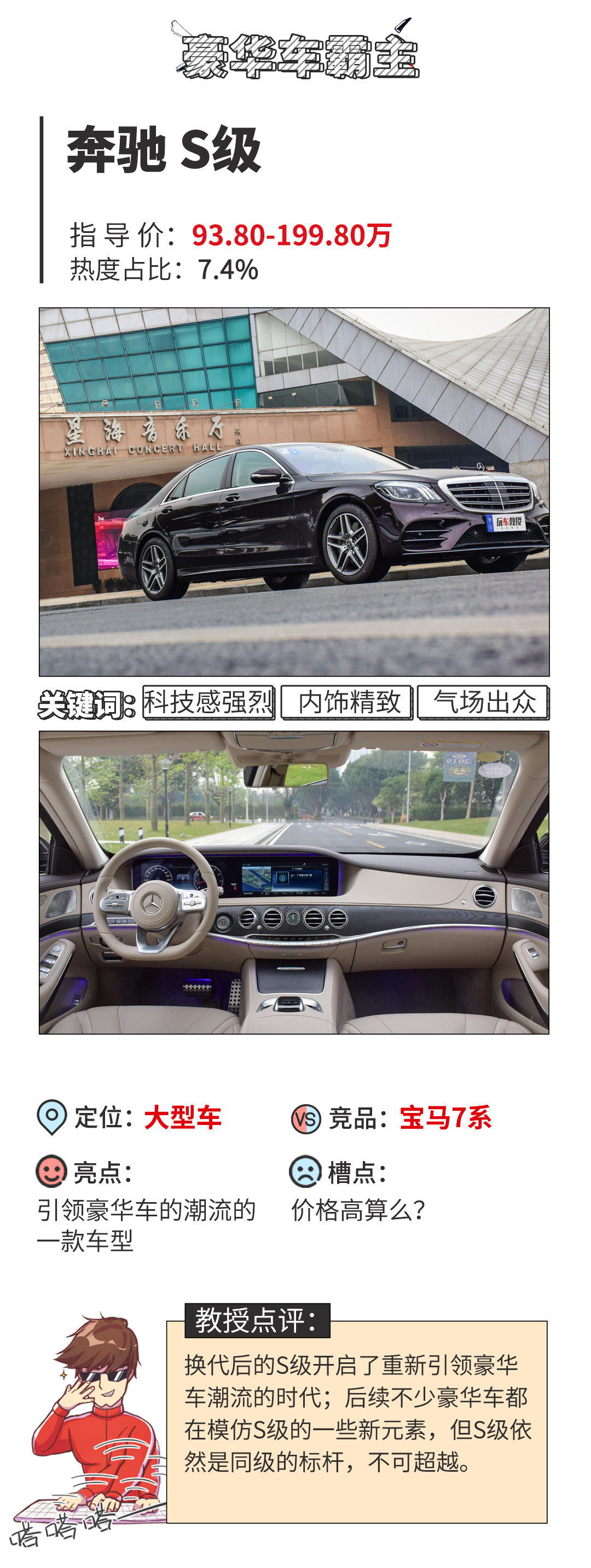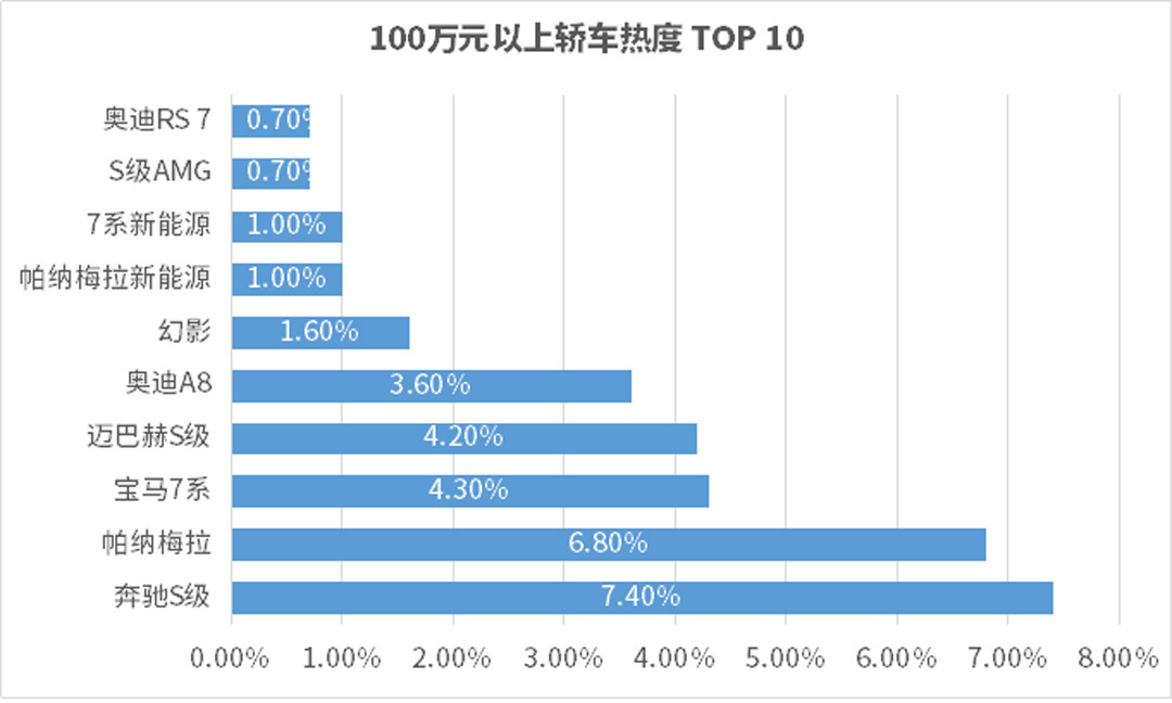 虽然奥迪成为30-100万元区间购车热度最高的品牌,不过当预算到了100万以上的区间时,奔驰的优势明显更大。虽然从数据上看,保时捷帕纳梅拉与全新S级的差距不大,但它与S级目标人群明显不同,奔驰S级商务气息更浓一些,事业有成的中年人士明显更喜欢S级的气质。