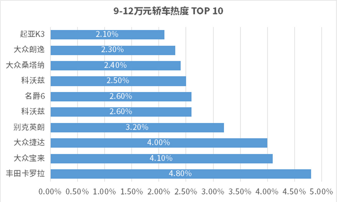 说实话,在9-12万的购车预算热度中看到卡罗拉的身影确实有些意外,这意味着大多数有意购买卡罗拉的消费者都只考虑它的入门车型,但这对于卡罗拉这售价10.78-17.58万元的紧凑车来说,只能大幅度的优惠才能吸引足够多的消费者,有些不太划算。要知道,这个区间不乏像名爵6、荣威i6这两款实力出众的兄弟车型,它们除了品牌力略逊一筹之外,在设计以及配置方面领先卡罗拉不少。