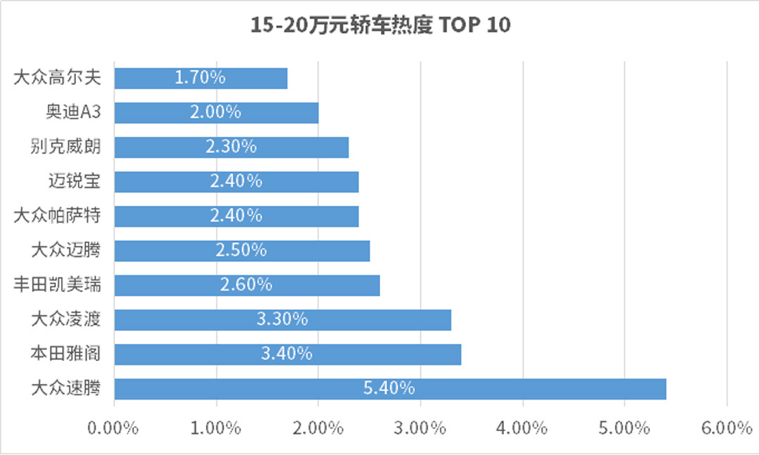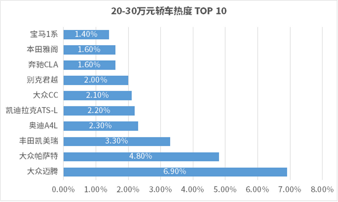 毫无疑问,迈腾仍然是20-30万元的预算的购车热度霸主。自从换代以后,产品力有了明显的提升,相较于对手有着明显的优势。不过随着全新凯美瑞的上市,这个优势有可能在未来被打破。除此之外,自家帕萨特如果能够在18年进行换代,也有可能威胁迈腾目前的地位。