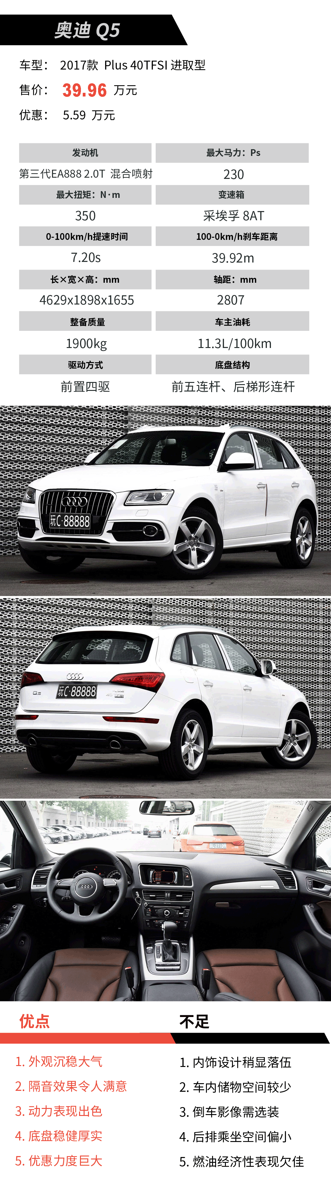 与同级对手相比,外观、内饰稍显落伍的Q5已进入产品末期,但凭借以价换量的策略,Q5在18年首月仍斩获同级销冠。据悉,全新Q5或将于今年4月上市,不仅轴距加长,而且适时四驱将替换全时四驱、7速Stronic双离合变速箱将替换采埃孚8AT,风阻系数也从现款的0.33cd降到0.3cd。届时能否续写销量佳绩?让我们拭目以待。