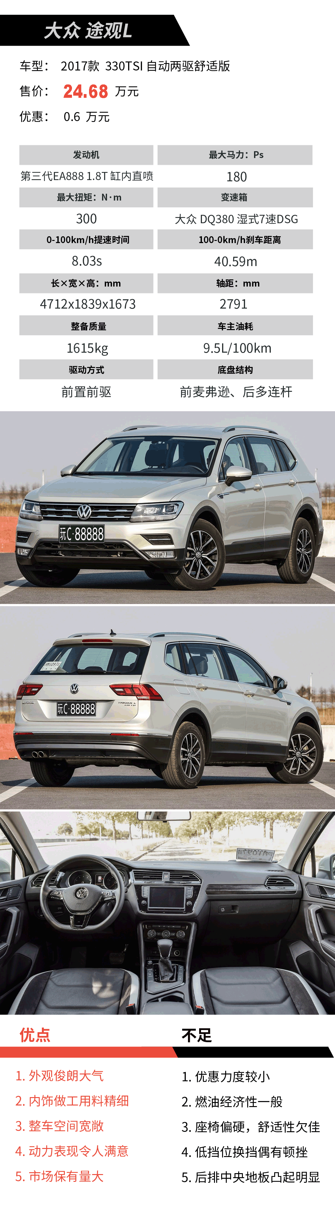 层次分明的横拉式前格栅、笔直挺拔的车身线条,塑造出一副硬朗立体的身躯。宽敞的空间、均衡的性能表现以及品牌光环是其屡获销量佳绩的资本;让人意外的是,途观L的1.8T车型已被停产,并由2.0T低功率车型替代,不过加量不加价亦是美事一桩。据悉途观L未来还有望推出1.4T的版本。