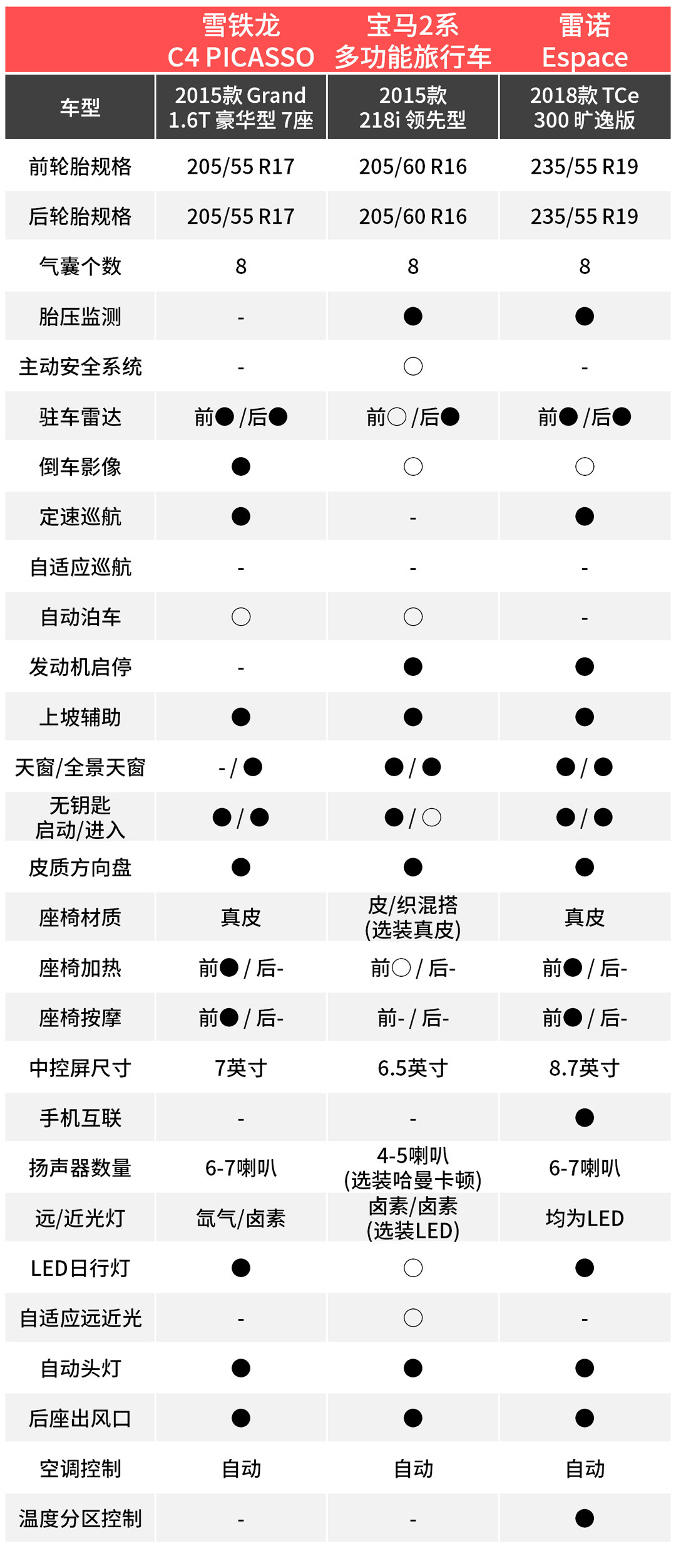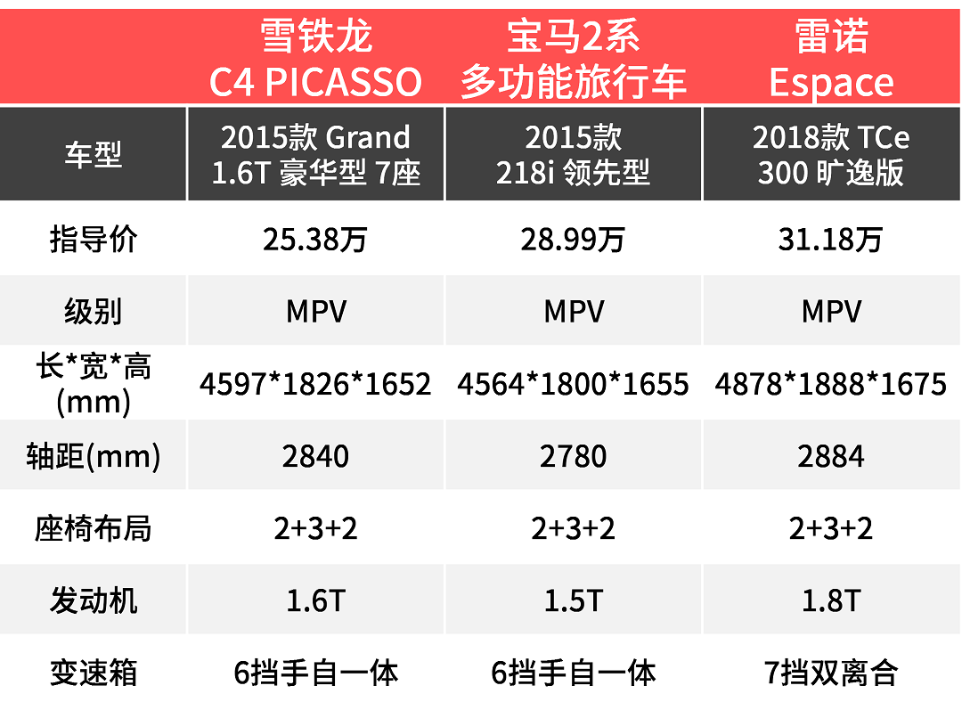 教授带来另外两款对比的车型分别是 雪铁龙 C4 PICASSO,也就是毕卡索,推荐车型为顶配的2015款 Grand 1.6T 豪华型 7座;另一款是一线豪华品牌的宝马 2系多功能旅行车 218i 领先型,是比较多人购买的入门版;对比雷诺性价比还不错的中配车型 2018款 TCe 300旷逸版。