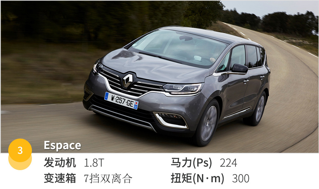 而雷诺Espace搭载的1.8T发动机,最大马力可以达到224匹,最大扭矩300N•m,在7速双离合变速箱的配合下,实测百公里加速可以跑到8秒左右,账面数据和动力表现在三款车当中是最好的。
