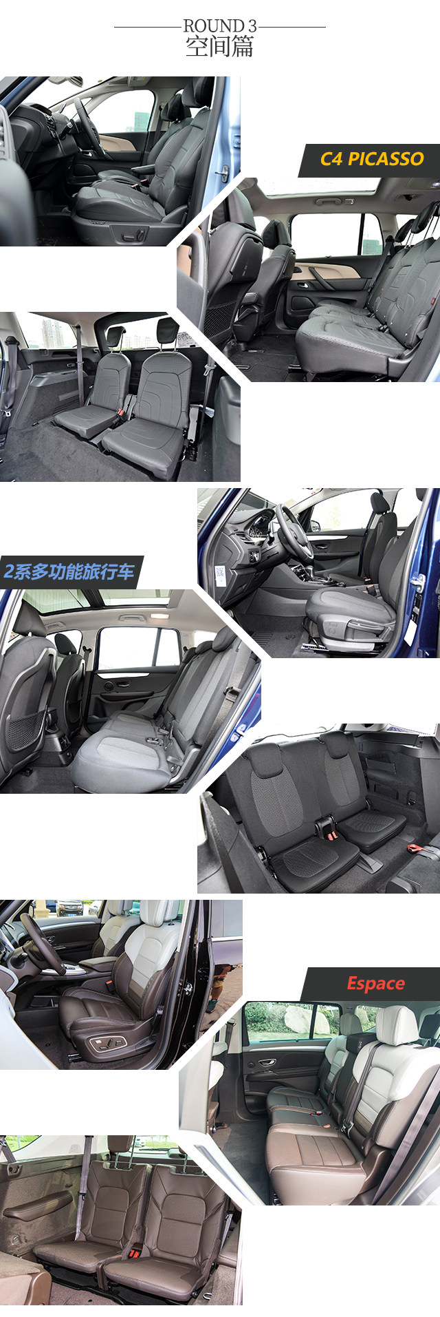 后备厢空间方面,三款车后排都能等比例放倒,放倒后车厢平整度依次是毕卡索、2系MPV、Espace。