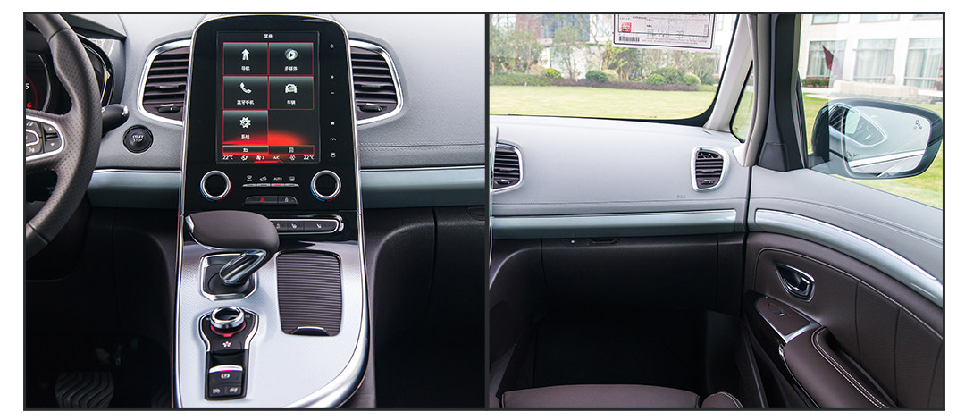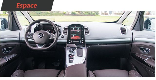 相比之下Espace的内饰就清秀简约很多,一块纵置的面板集成了中控绝大部分操作键,简洁但设计感非常强,中控屏采用纵向布置,中控台上方是搪塑工艺,内门板也用上大面积皮革包裹,豪华感满满的。