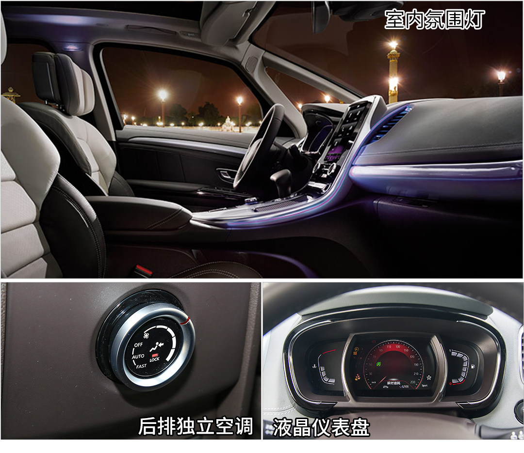相比之下Espace就好很多了,毕卡索有的基本都有,还带全液晶仪表盘、前排座椅按摩/加热、CarPlay、LED远近光灯,车内氛围灯,还有后排独立空调,配置高度比较令人满意,毕竟价格去到30万了。