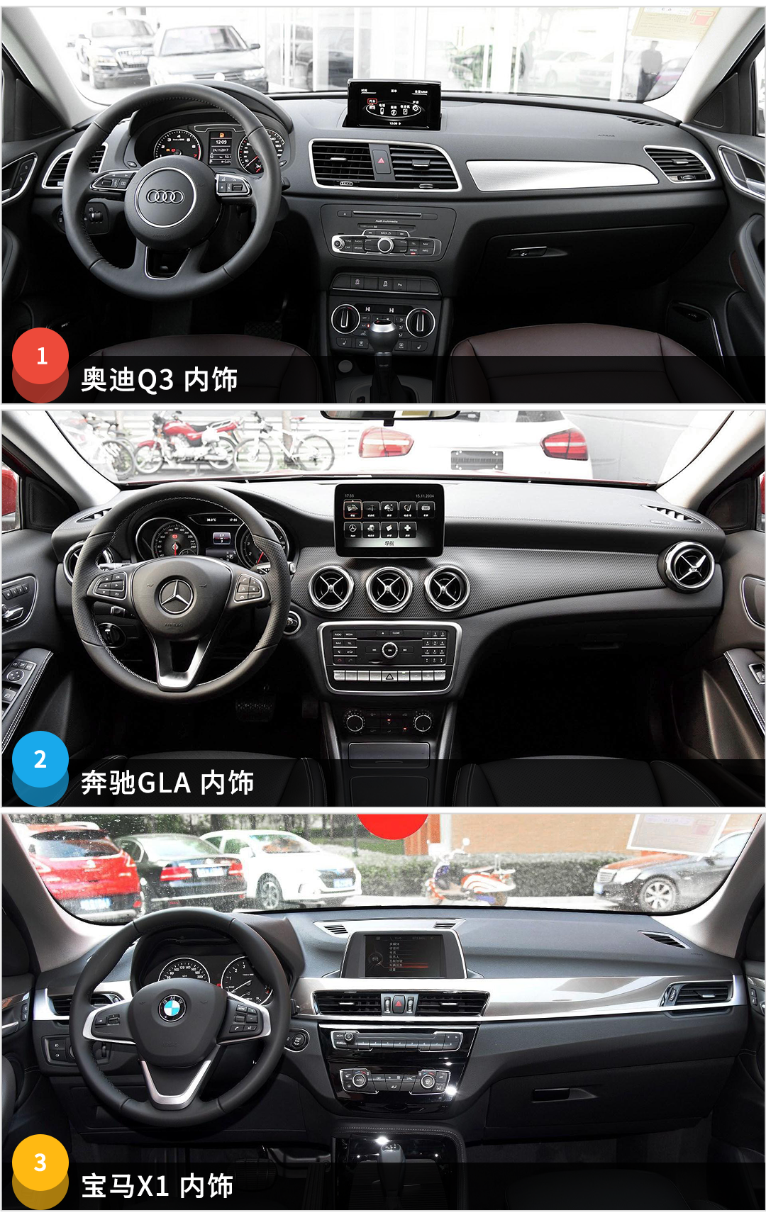 三款车的内饰在设计上的确有高低,奔驰GLA的内饰在整体观感方面做得比较好,而奥迪Q3是最没特色的,即便是高配车型也是这样。但作为豪华车,当这些车型的真车近在眼前的时候,你就会发现它们的内饰质感的确要比同价位普通品牌的车型要好一些。