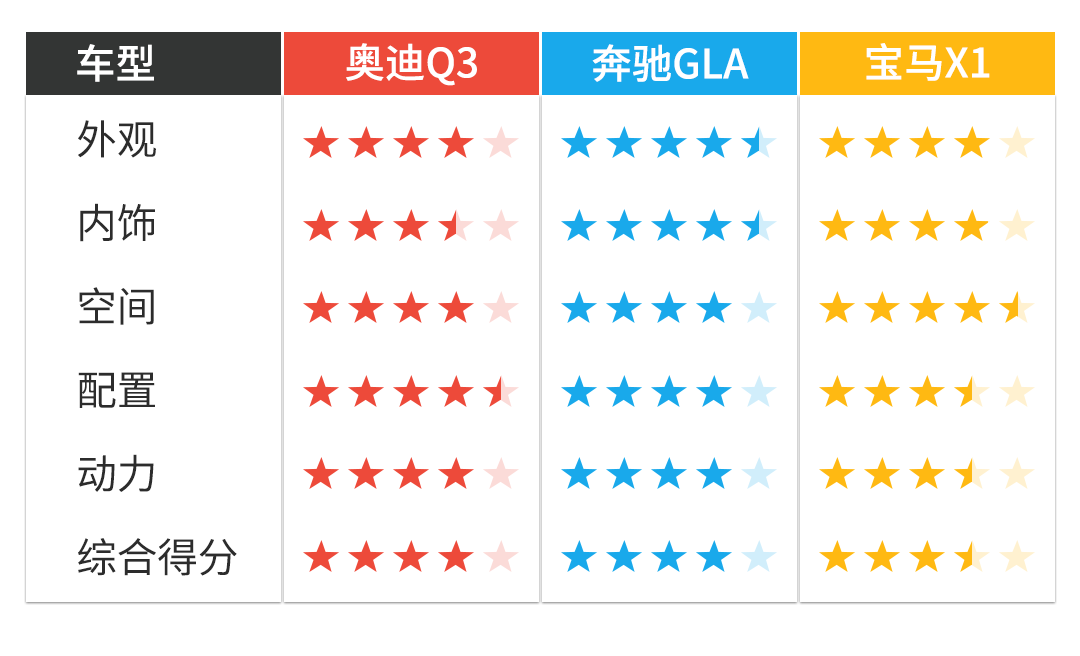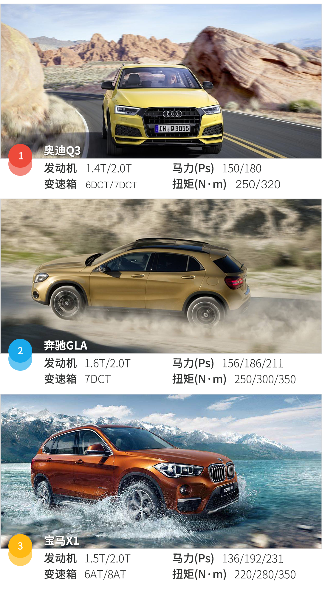 虽然三款车在价格上有细微的差距,不过它们之间的确是竞争对手。宝马X1在尺寸方面占优势,但不再是后驱车型,动力表现也一般;奔驰GLA在设计和动力方面做得最好,对年轻人而言更有吸引力;至于奥迪Q3嘛,虽然看起来没啥优势,但是它的价格低呀!