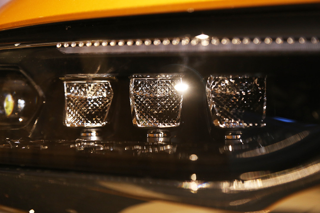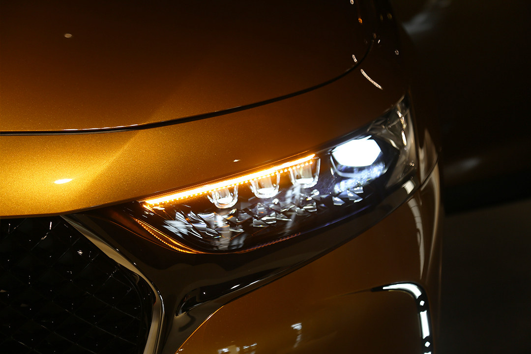 外观最大的亮点在于前后大灯,最为惊艳的在于这个“巴黎之光”LED智能前大灯,三颗宝石状的LED等;