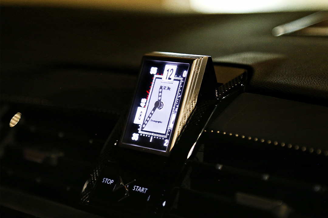 有一个非常具有仪式感的东西,就是中控台上方有一个表,引擎未启动的时候是表面朝下,表的下方是引擎启动按钮,车辆启动之后表面会180度翻转,来自B.R.M,据讲解人员介绍这块表在法国卖的过价值超过几万人民币。