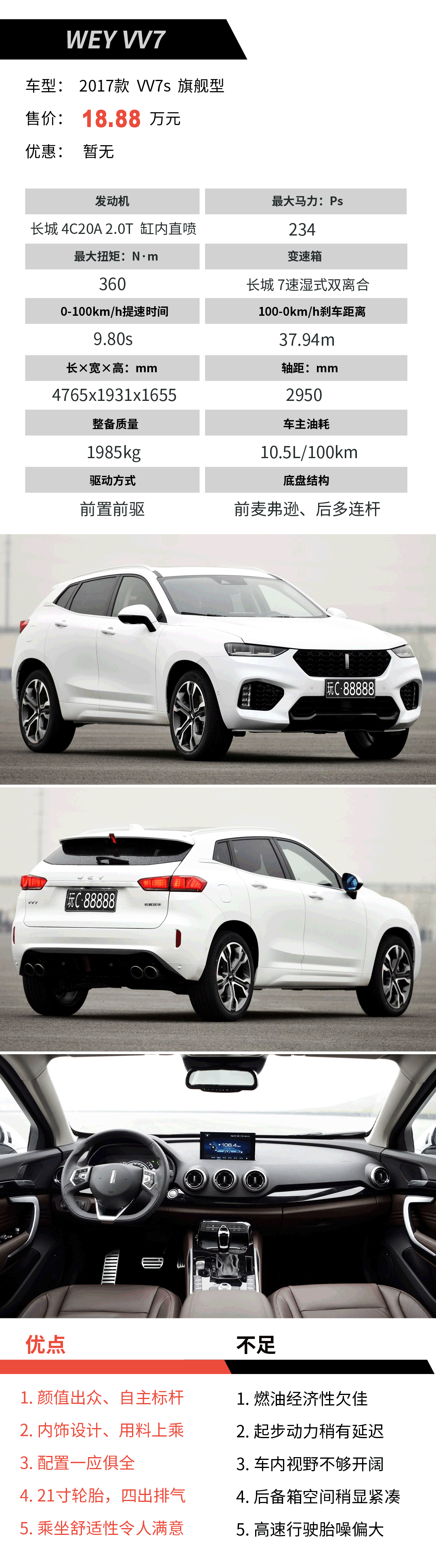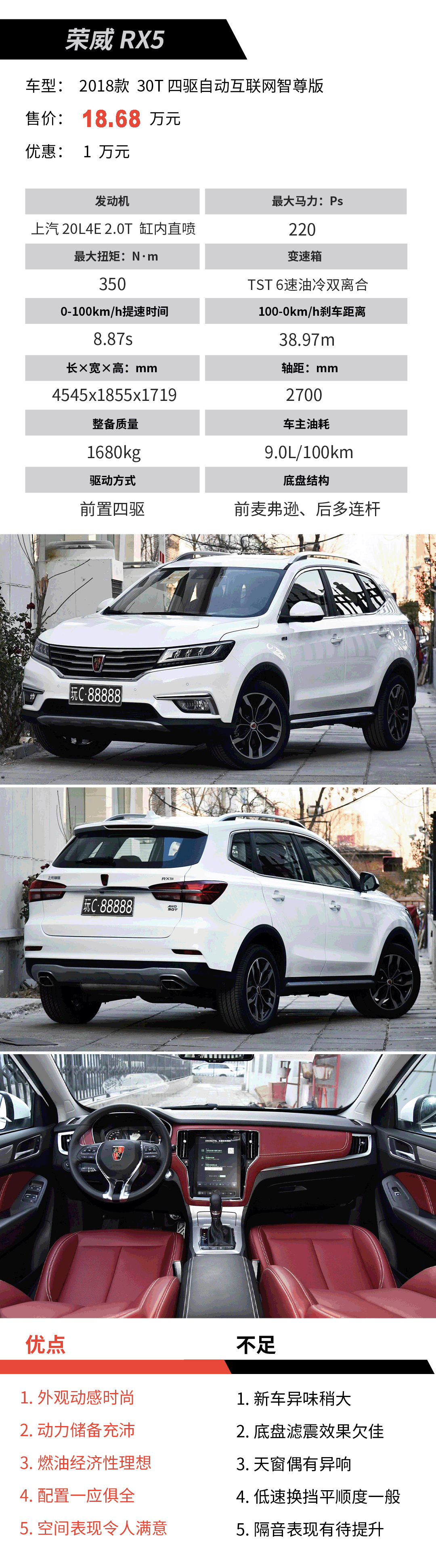 点评:源自Vision-R概念车的展翼式前脸、律动设计,塑造出一具灵动而又富有张力的身躯。大尺寸中控屏、智能语音识别以及可通过APP实现手机操控汽车等功能,很好地诠释了互联网汽车理念。略显不足的是,为了提升行驶稳定性而设计的四驱系统,不仅脱困能力有限,还影响了加速能力。