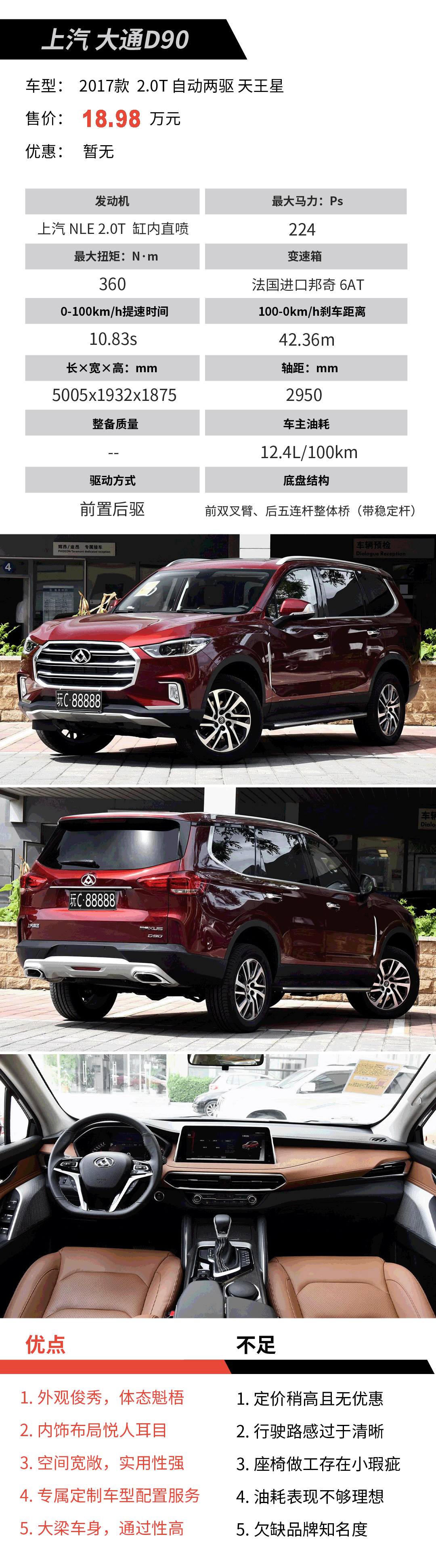点评:硬朗魁梧的身躯犹如一只公路猛犸,即便是一米八的壮汉在其面前也显得渺小。令人倍享尊崇的智能专属定制车型服务以及非承载式车身是其招徕用户的资本。然而2.0T发动机拉动庞大的身躯显得不太积极,且刚性极强的大梁车身搭配调校偏软的悬架,带来如颠舟般的驾乘感受也确实不太美妙。