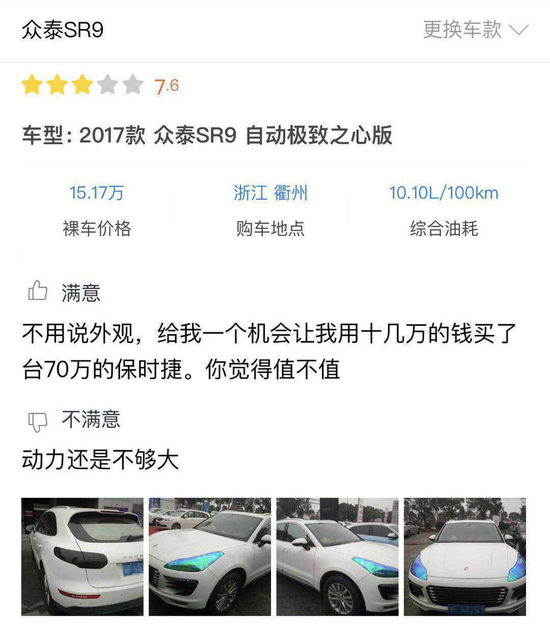 教授辣评:可以说SR9再一次刷新了大家对众泰这一个品牌的态度,论模仿能力,最强的也就只有它了!像SR9,不用多说,就是模仿保时捷Macan的造型设计,假如不仔细看,或许也能欺骗到不少路人。