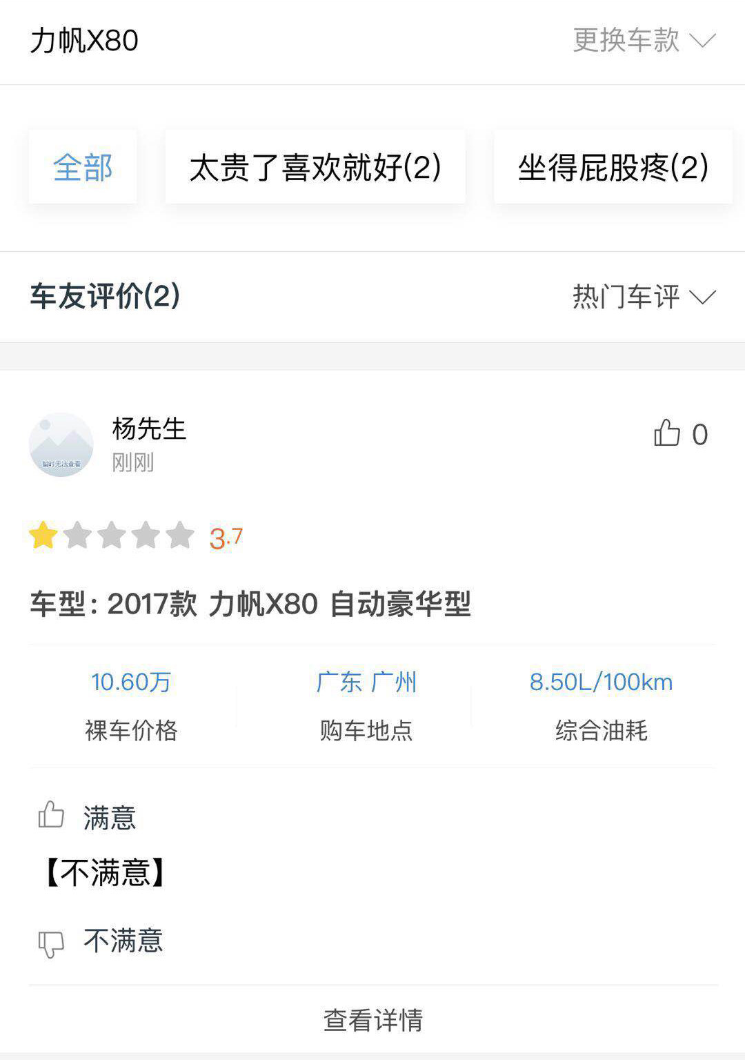 最满意的一点:最满意的是X80的空间,个人非常喜欢自驾游,所以对空间非常看重,这车驾乘空间足够宽敞,前排脚下空间很宽敞,每排座椅之间距离很宽,不会蜷得难受,后备箱更是超大使用,自驾游装行李,爬山装设备,野炊装器具都毫无压力。